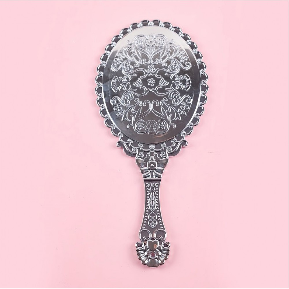 Ручне дзеркало «Срібна Винтажна Леді» — красивий аксесуар у ретро-стилі для макіяжу, фотосесії, подарунка або декору туалетного столика. Срібляста рамка з візерунковим оформленням виглядає нарядно і добре підходить для жіночого подарунка, б'юті-зони, салону краси або тематичної фотозйомки.