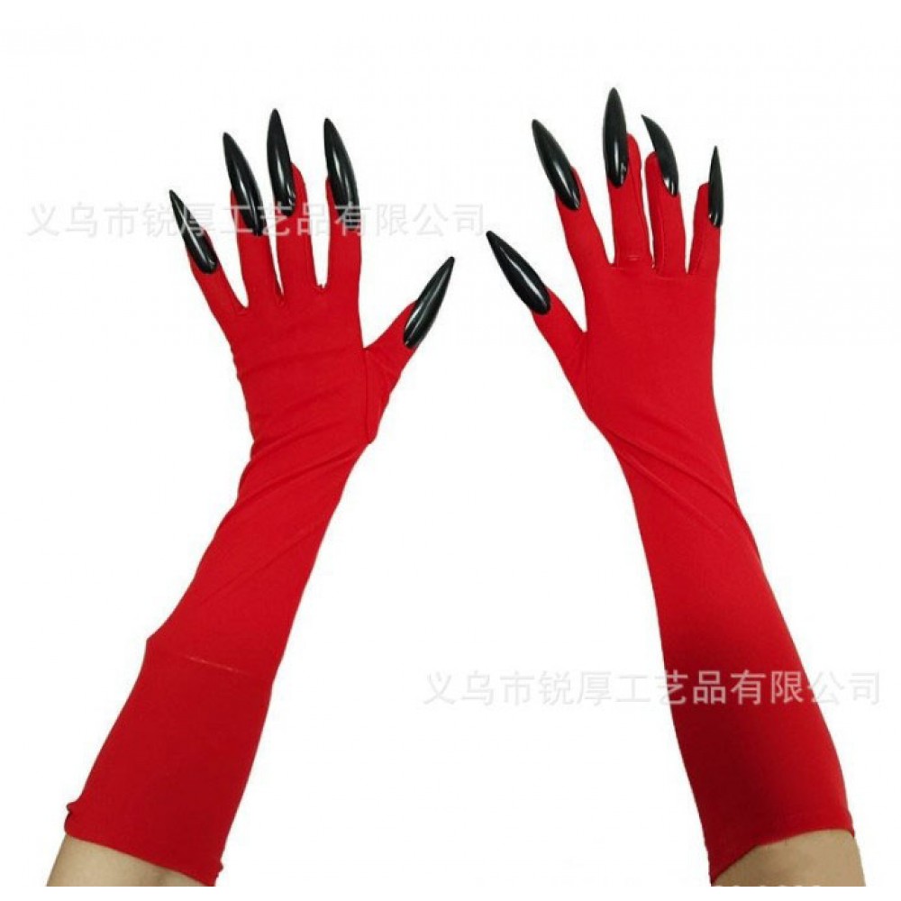 Рукавички відьми червоні з чорними кігтями 42 см, на Гелловін