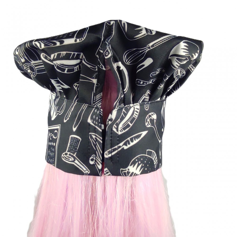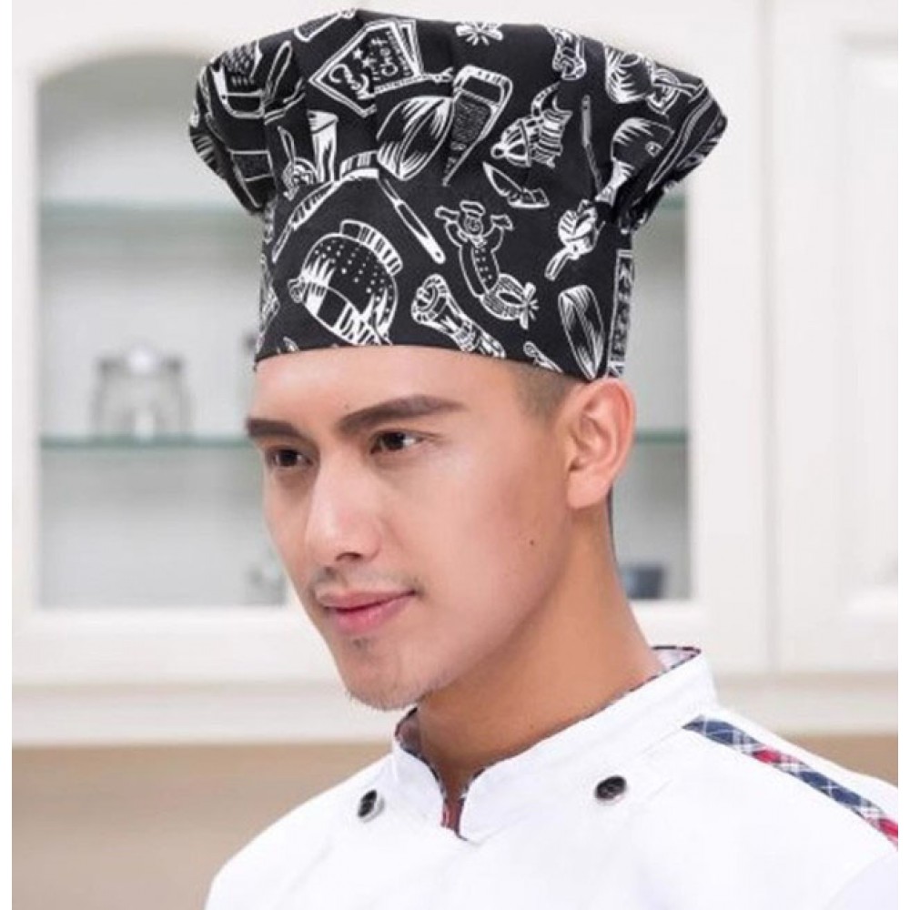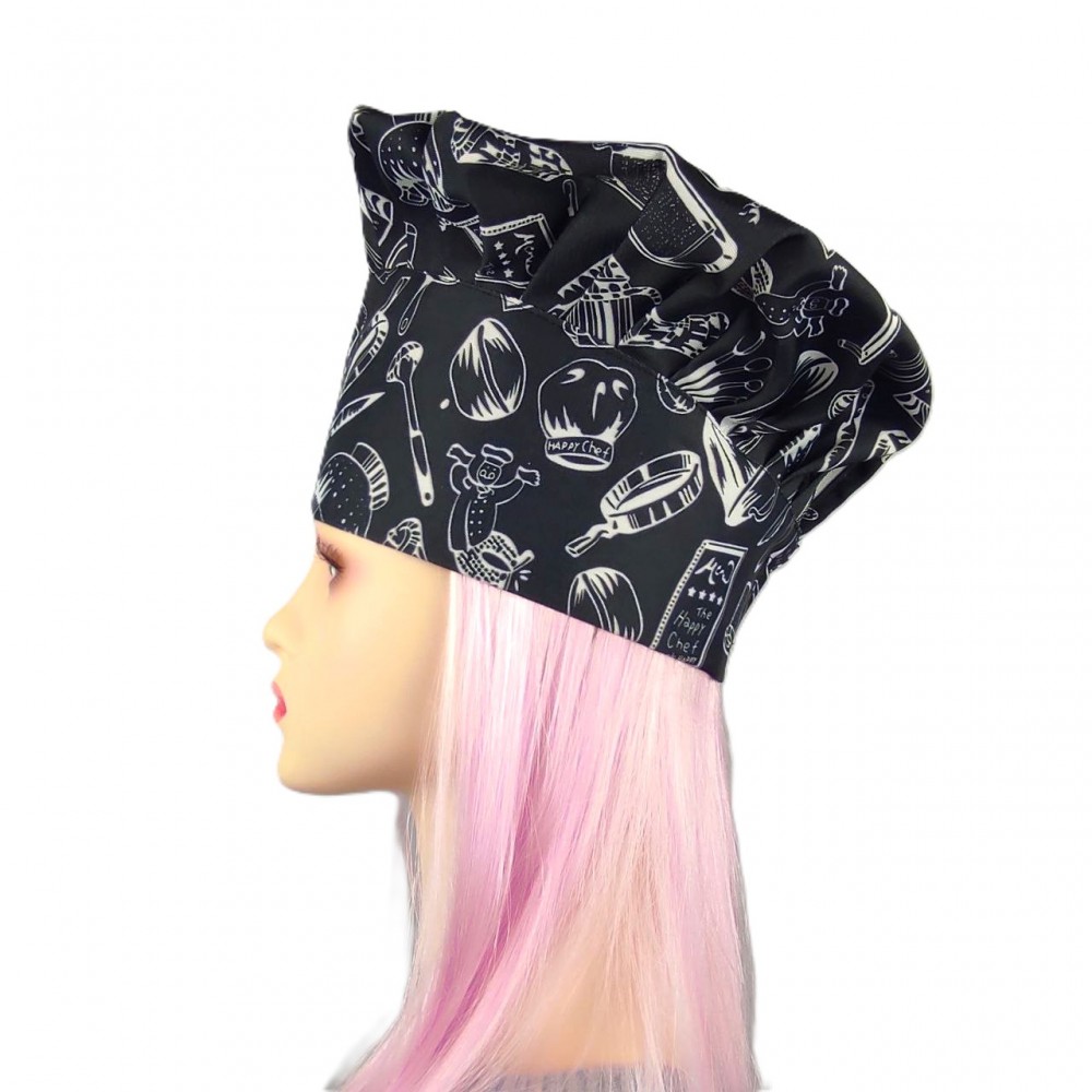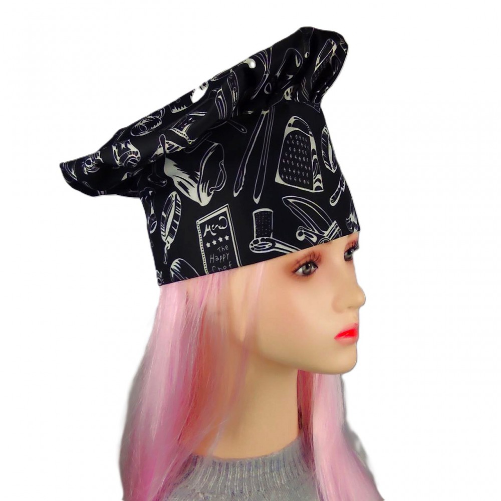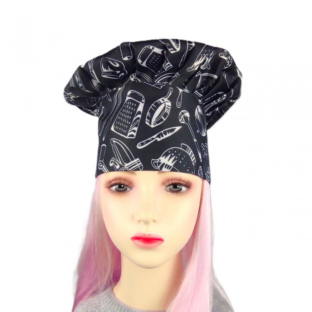 Шапка шеф-кухаря прикрашена сучасним принтом у стилі скетч-арт, де зображення кулінарних елементів створюють динамічну композицію. Контрастне поєднання чорного фону та білих малюнків робить цей кухарський головний убір помітним і стильним аксесуаром професійної кухні.