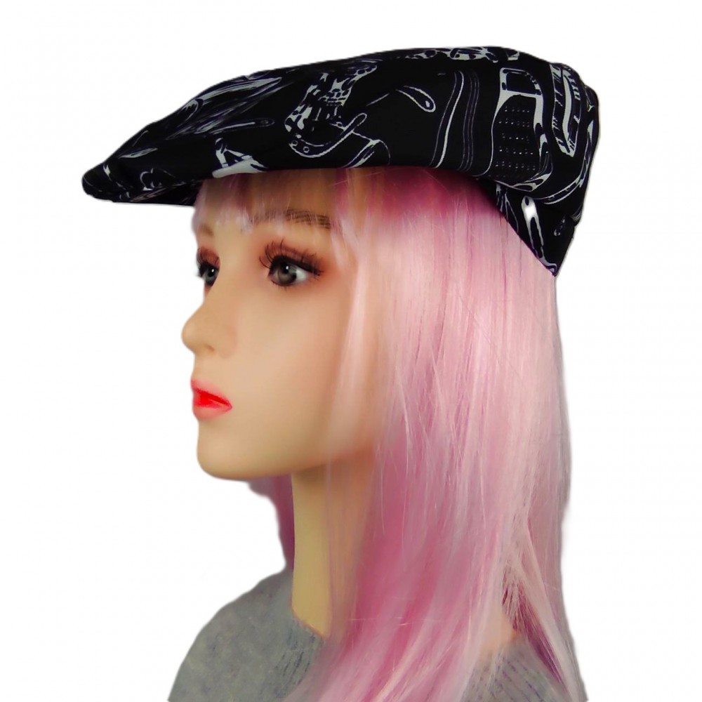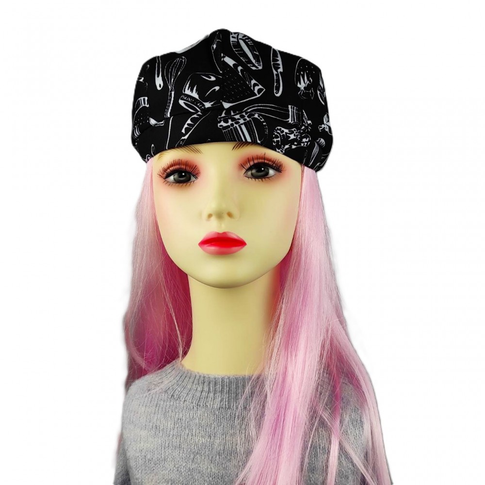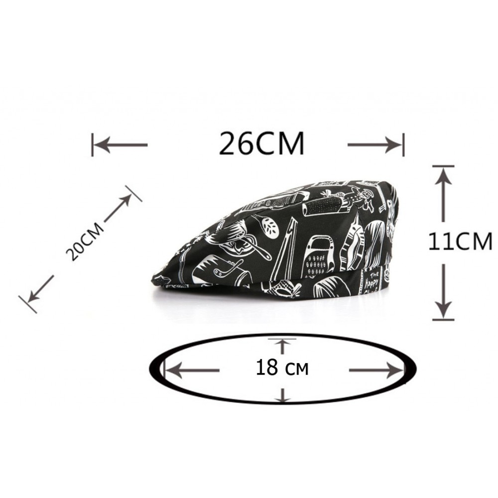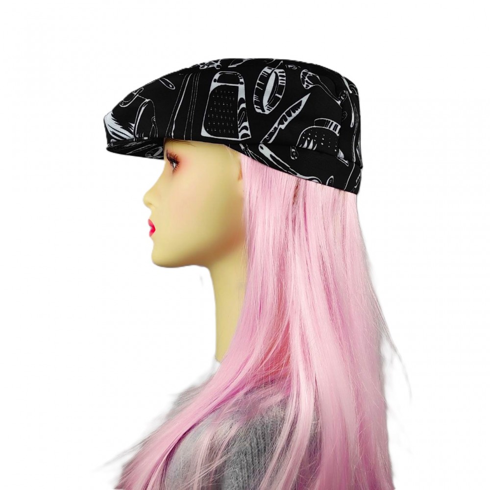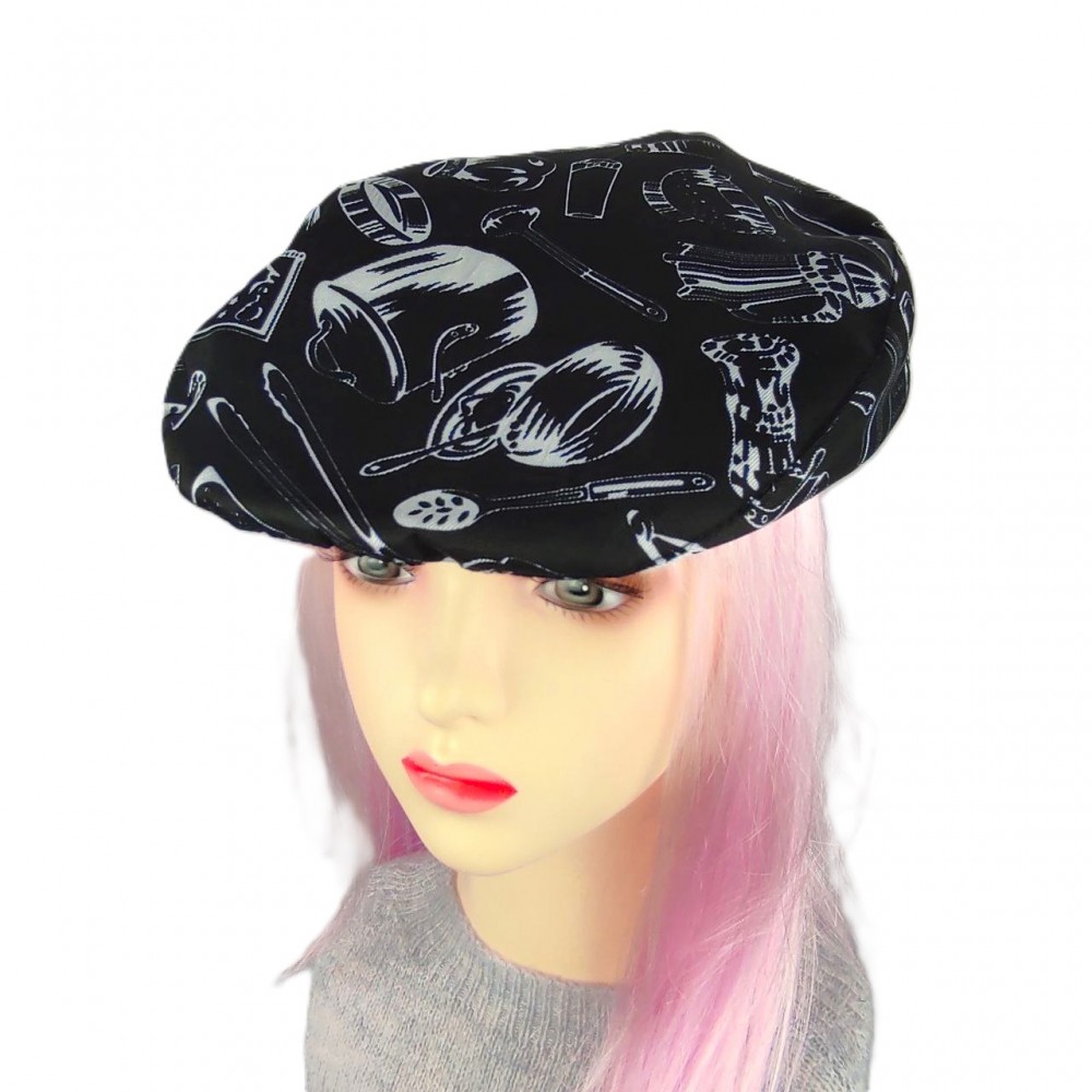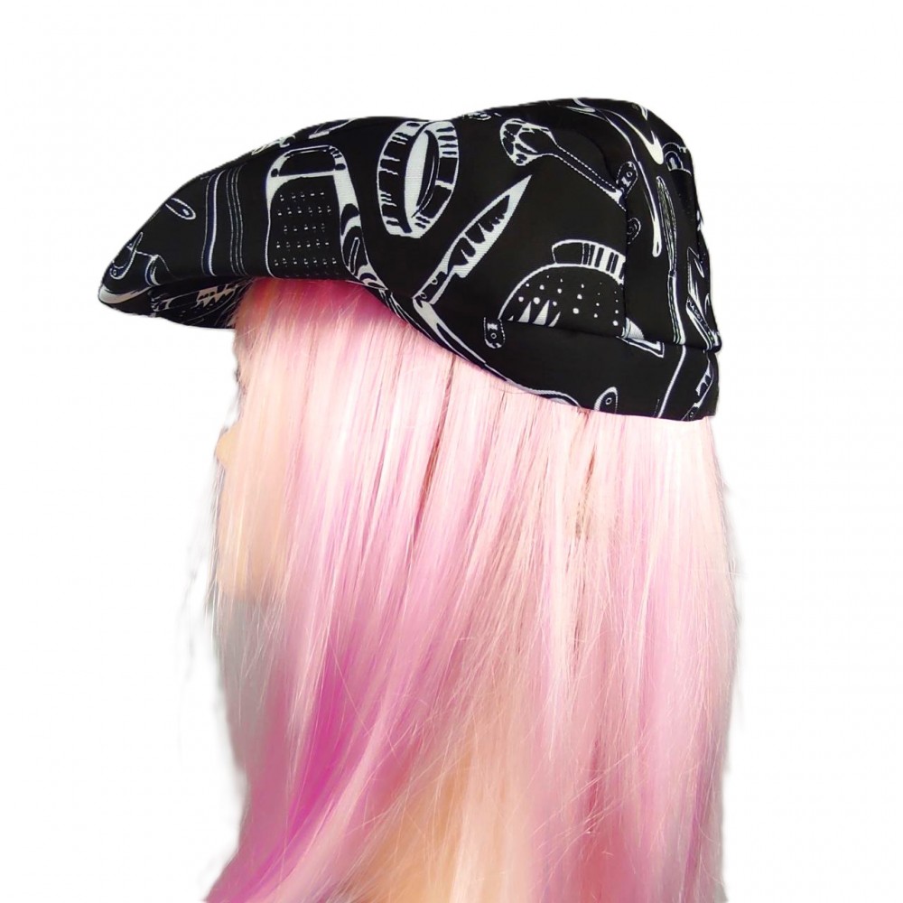 Стильний головний убір кухаря з унікальним дизайнерським принтом кухонної тематики. На чорному фоні кухарської кепки зображені білі графічні елементи кулінарного мистецтва - кухонне приладдя, інструменти та аксесуари шеф-кухаря, що робить цей аксесуар особливо привабливим для творчих кулінарів.