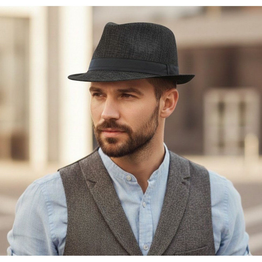 Модель виконана з легкого текстильного матеріалу з плетеною фактурою, добре тримає форму і комфортна при носінні. Чорна стрічка підкреслює силует і додає акуратний акцент, завдяки якому капелюх легко поєднується з костюмами, жилетами, сорочками, підтяжками та іншими аксесуарами у стилі Gatsby / Chicago 1920s.