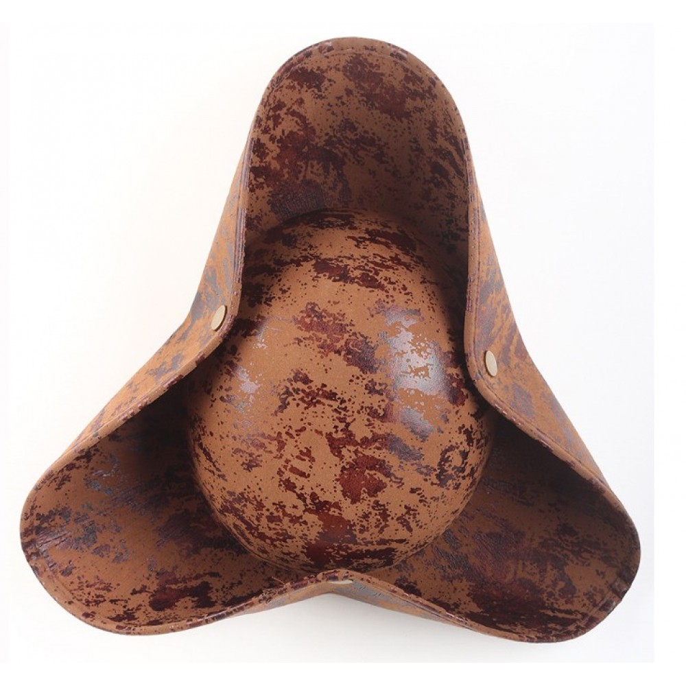 Кожна деталь капелюха ретельно опрацьована: від фактурної поверхні, що імітує потерту часом шкіру, до акуратних металевих заклепок по боках. Благородний коричневий колір з патиною створює враження справжнього артефакта часів золотого віку піратства.