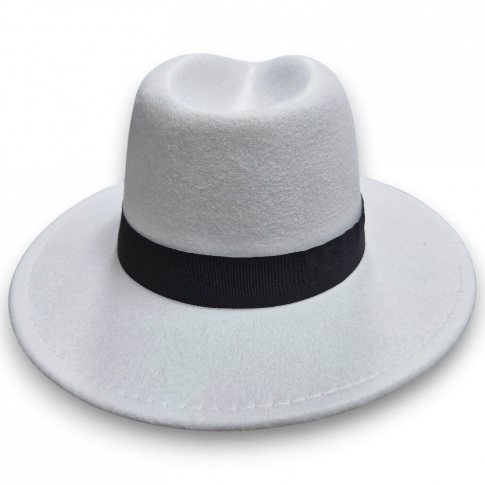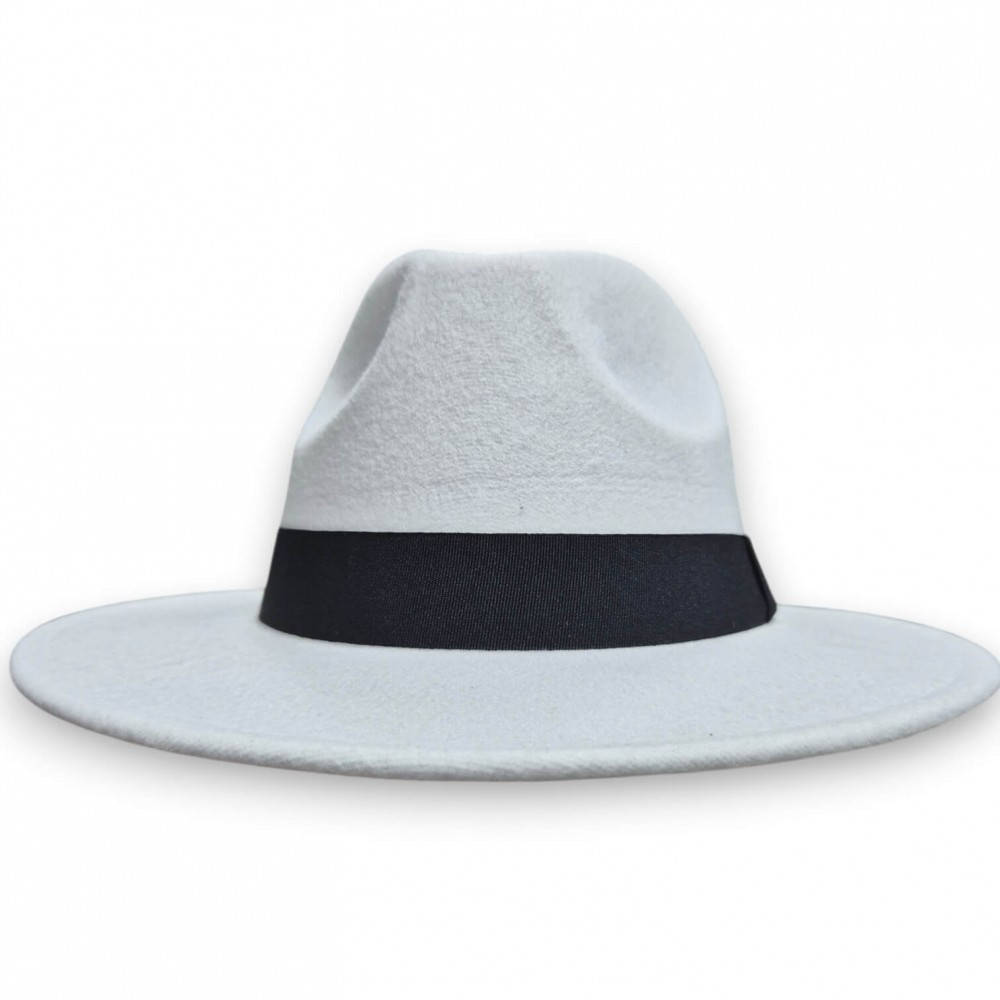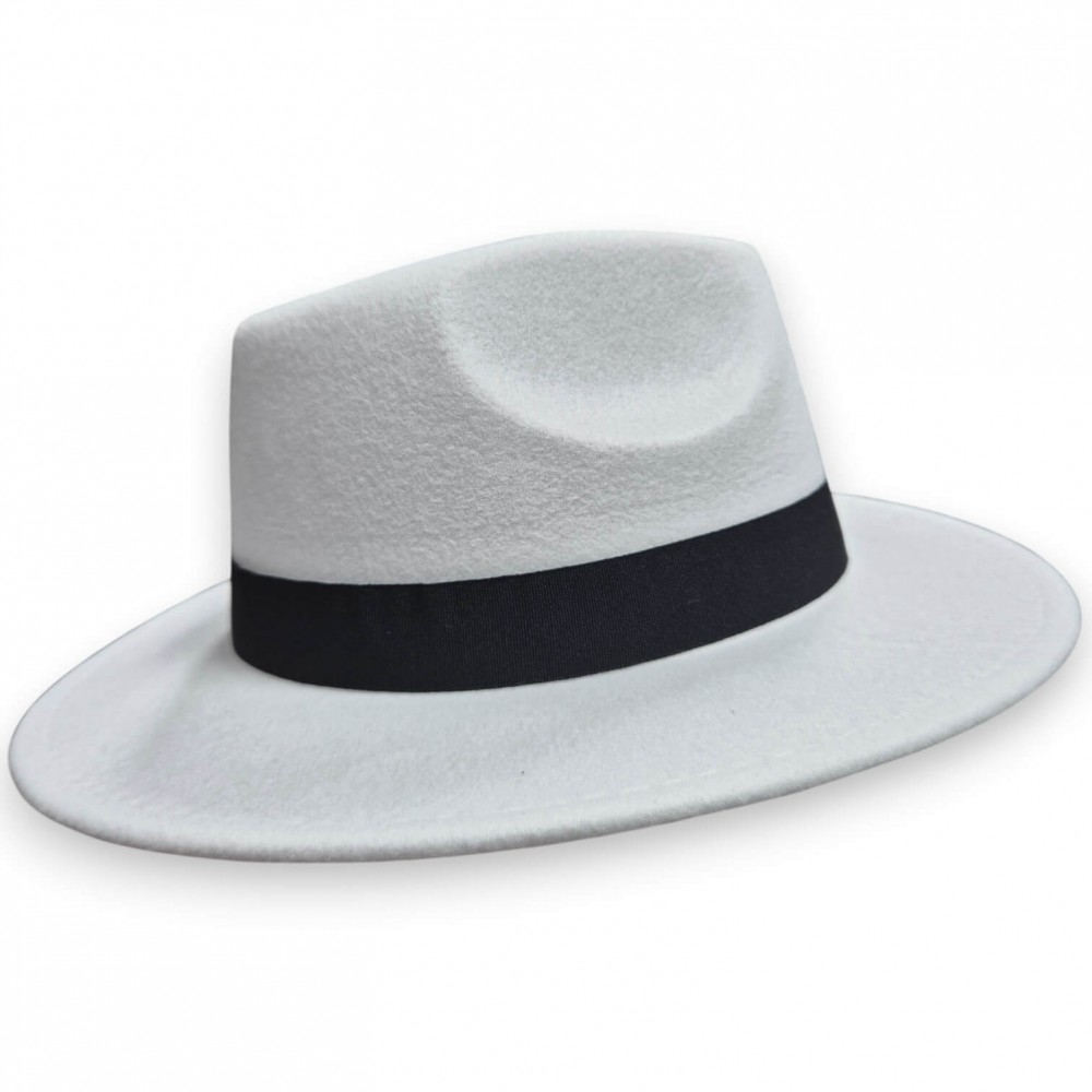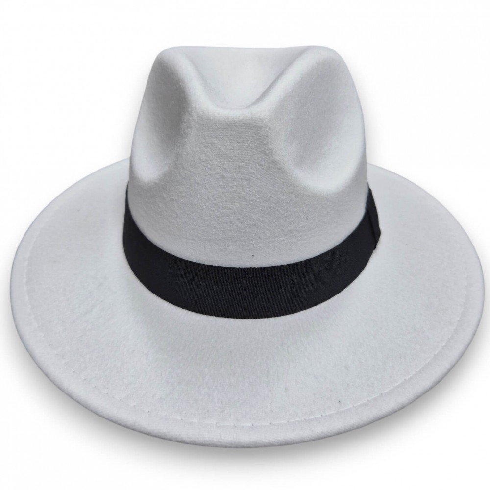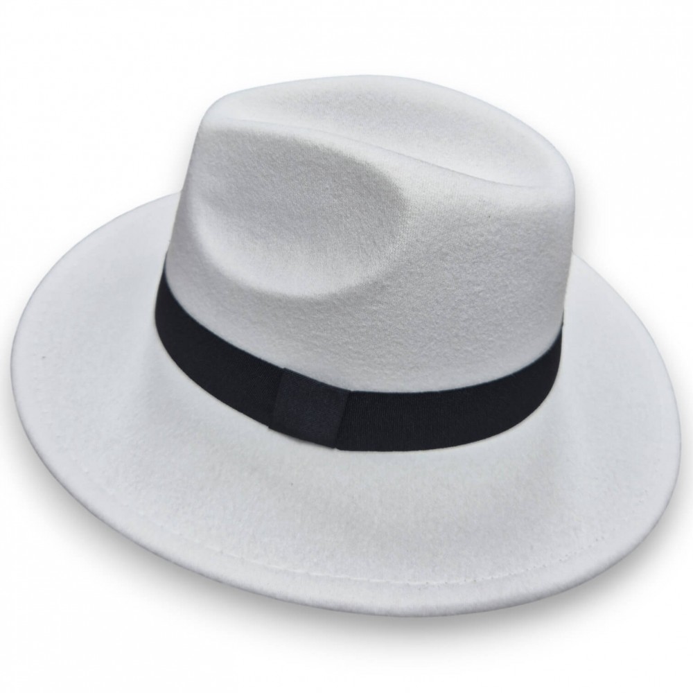 Білий колір робить капелюх особливо помітним в образі, а чорна стрічка красиво підкреслює форму та додає стильний контраст. Вона добре поєднується з сорочками, жилетами, підтяжками, сукнями та ретро-костюмами. Виглядає акуратно, свіжо та з характером — саме те, що потрібно для яскравої вечірки у стилі Гетсбі або мафії.