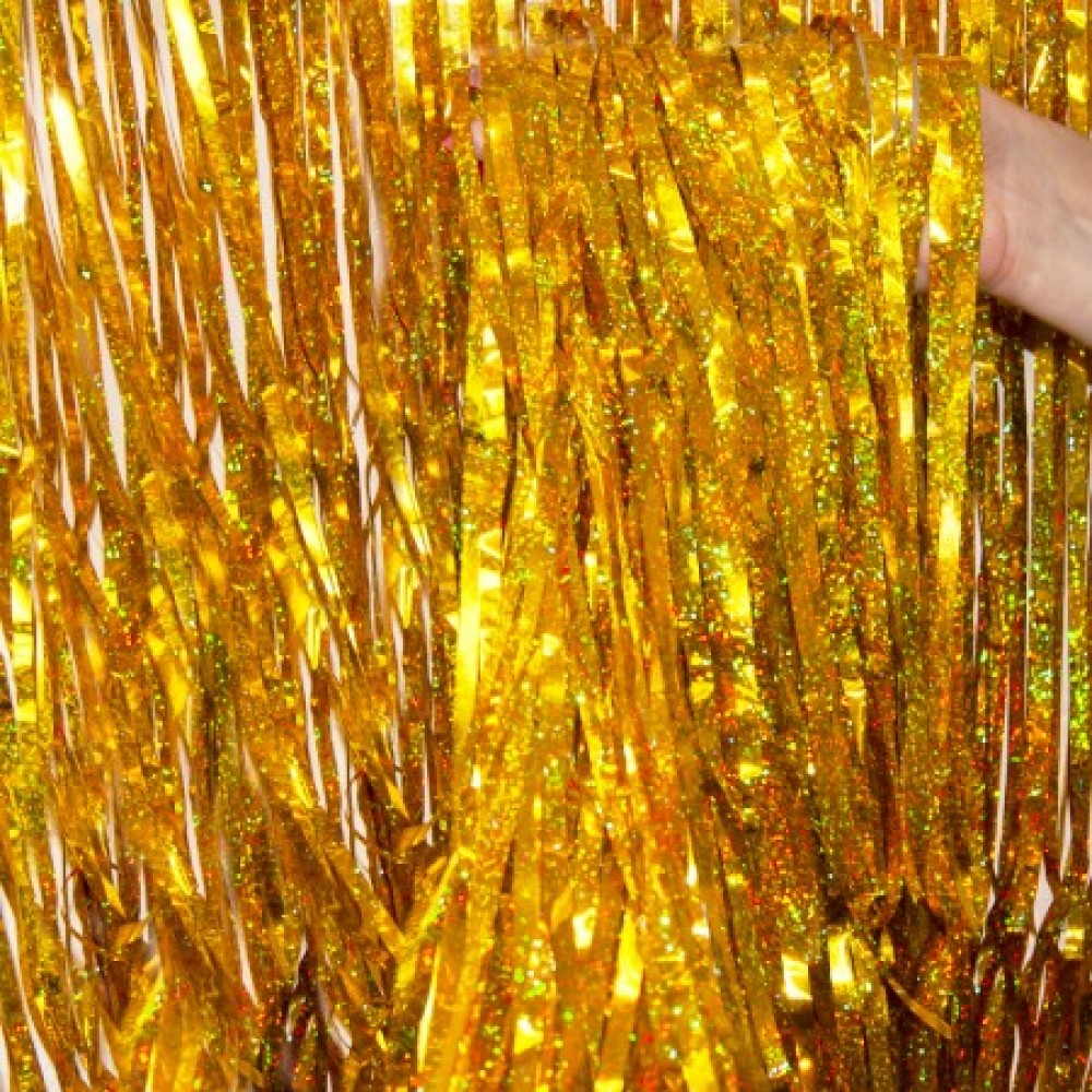 Яскрава голографічна золота штора з фольги розміром 1х2см (довжина 2м та ширина 1м). Шторки з фольги широко використовуються для оформлення та декорації сцен, фотозон, місць для фотосесій та створення святкової атмосфери в приміщенні! Шторка виготовлена із фольги гарної якості.