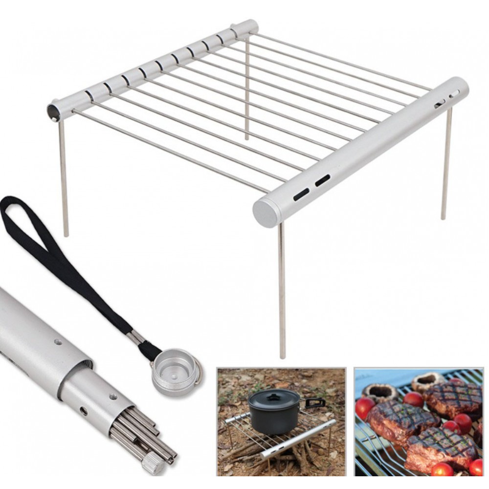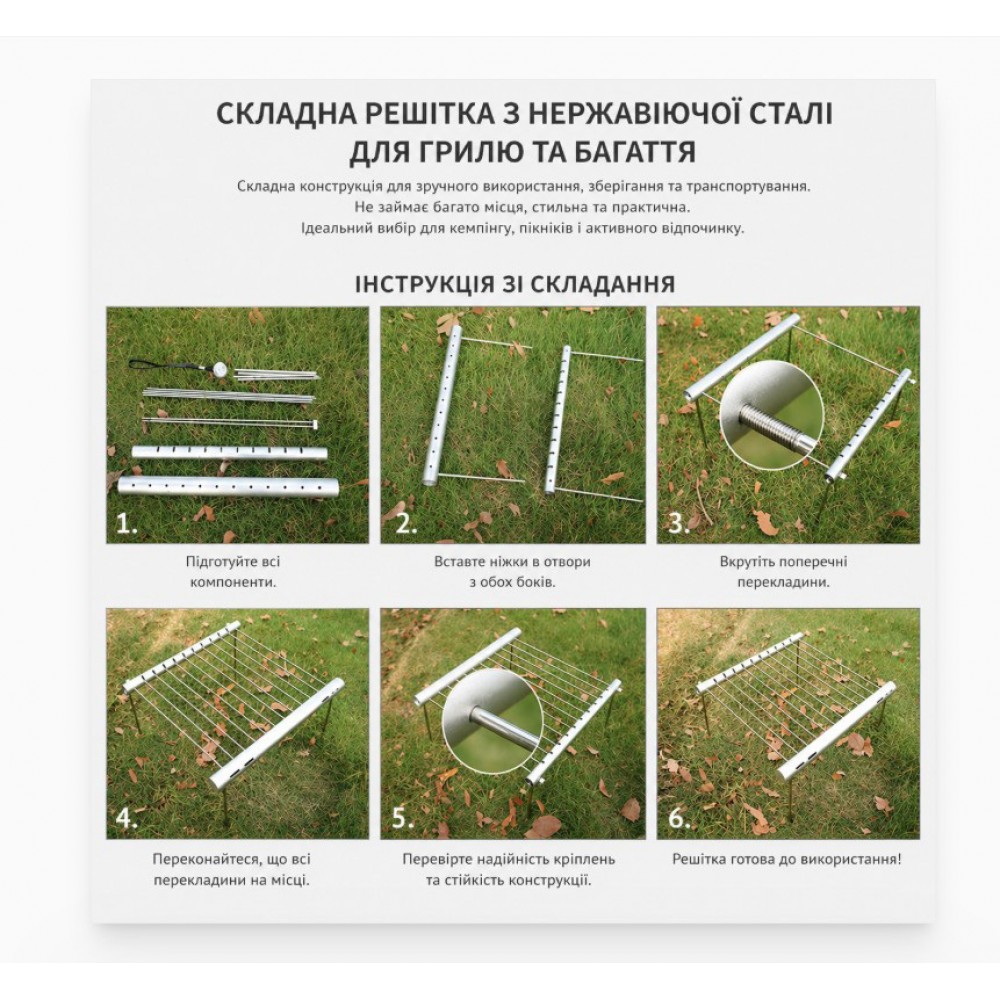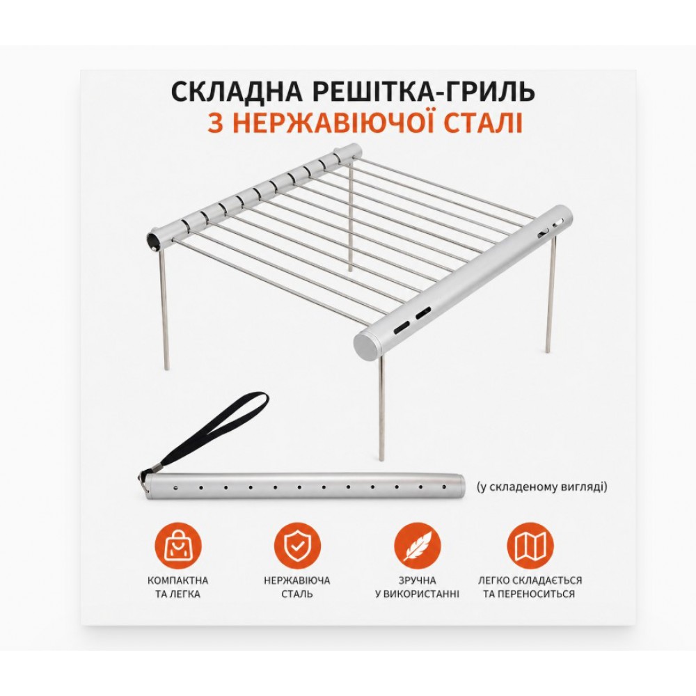 Складна решітка для гриля та барбекю — компактна підставка для приготування їжі на природі, в кемпінгу, на риболовлі або під час пікніка. Її можна встановити над вугіллям або невеликим вогнищем і використовувати для смаження м'яса, овочів, сосисок, а також як підставку під туристичний посуд. У складеному вигляді решітка збирається в вузьку трубку, тому займає мало місця в рюкзаку, машині або наборі туристичного спорядження.