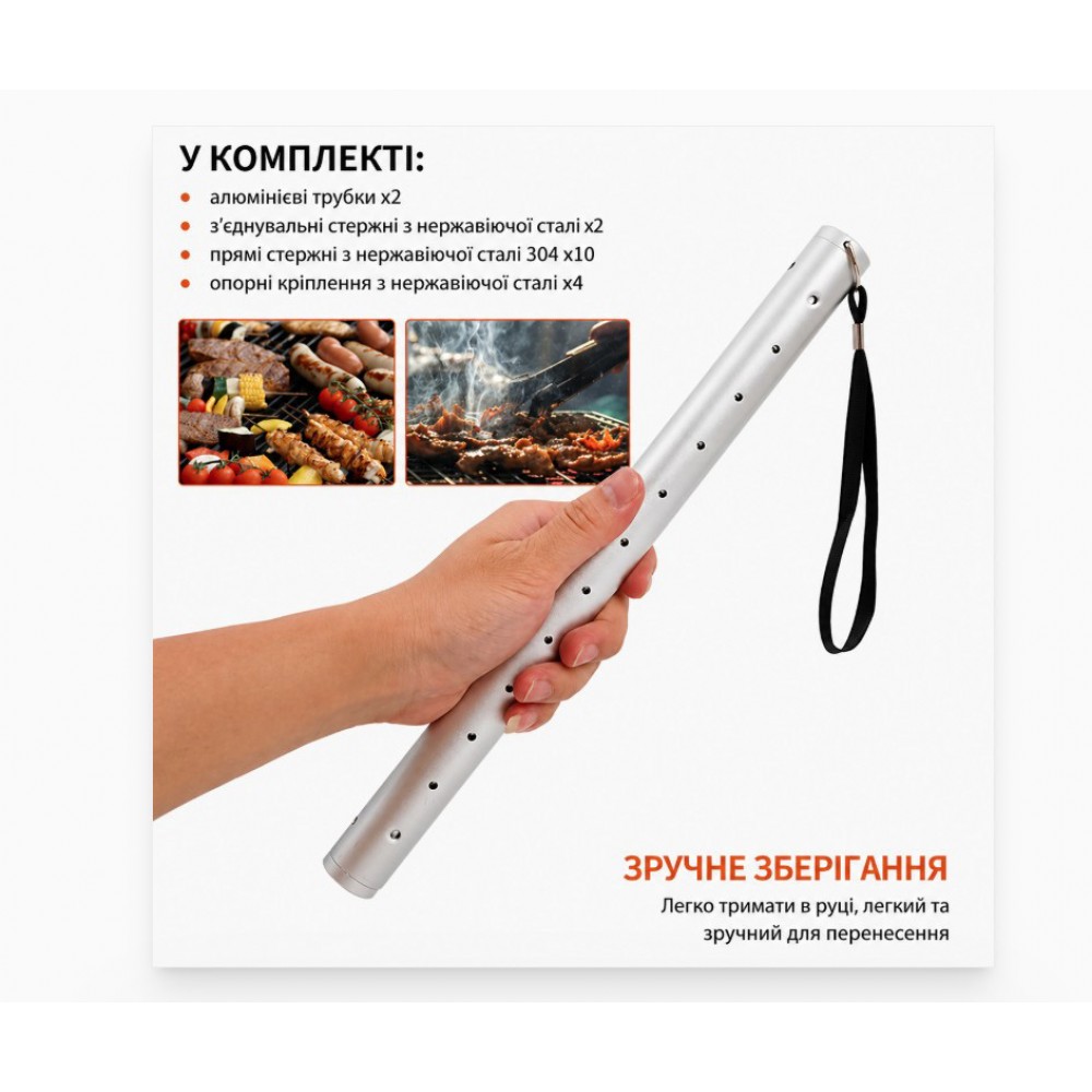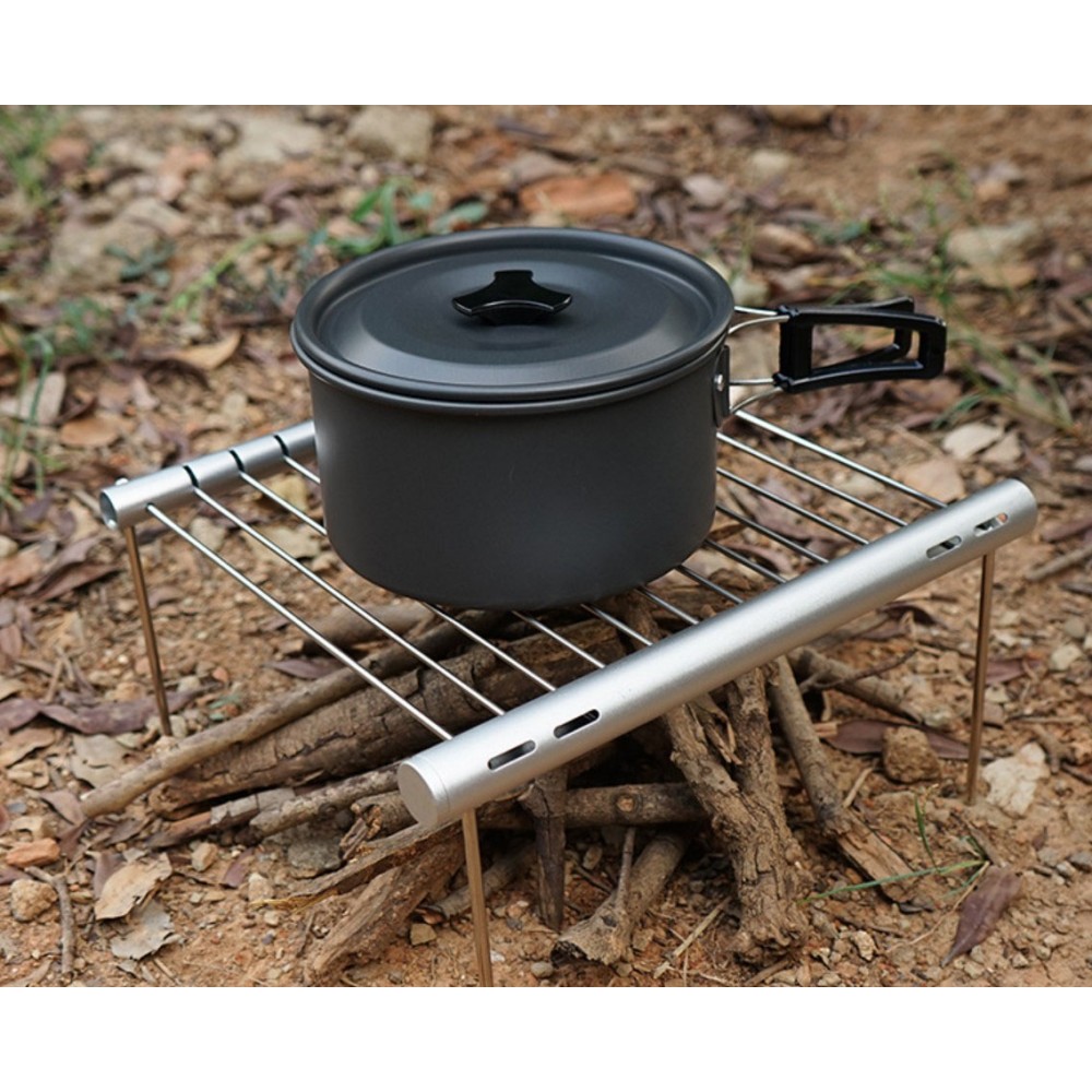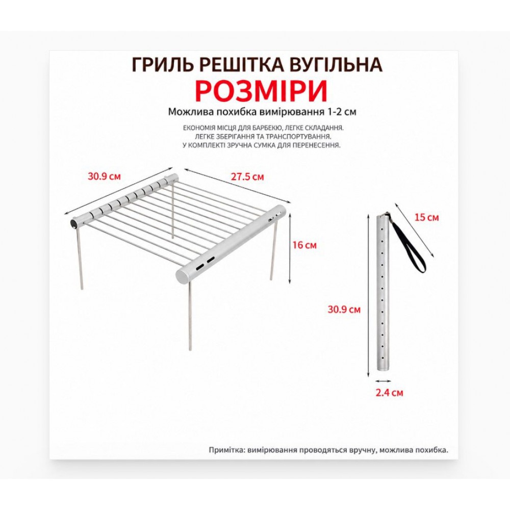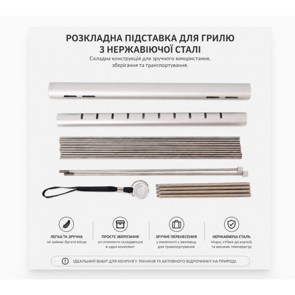 Складна решітка для гриля та барбекю — компактна підставка для приготування їжі на природі, в кемпінгу, на риболовлі або під час пікніка. Її можна встановити над вугіллям або невеликим вогнищем і використовувати для смаження м'яса, овочів, сосисок, а також як підставку під туристичний посуд. У складеному вигляді решітка збирається в вузьку трубку, тому займає мало місця в рюкзаку, машині або наборі туристичного спорядження.