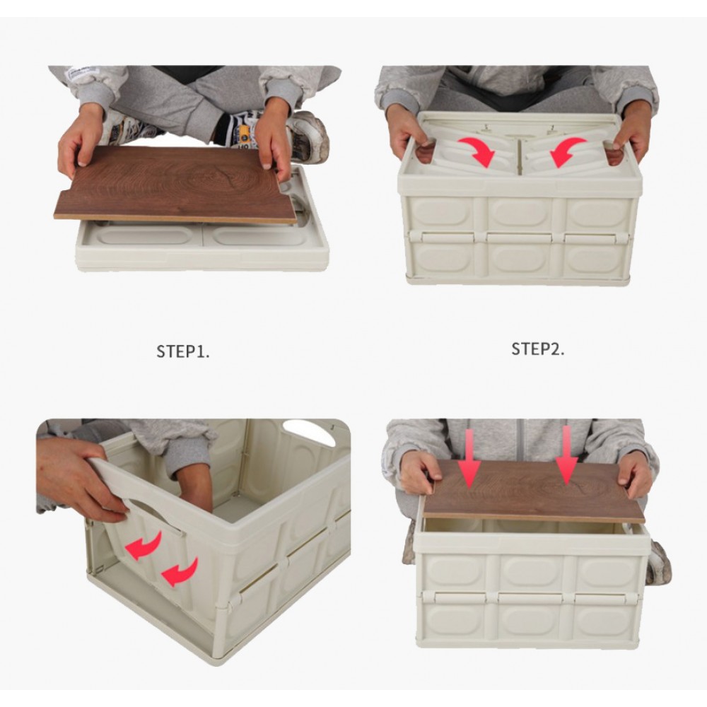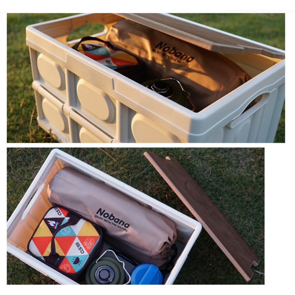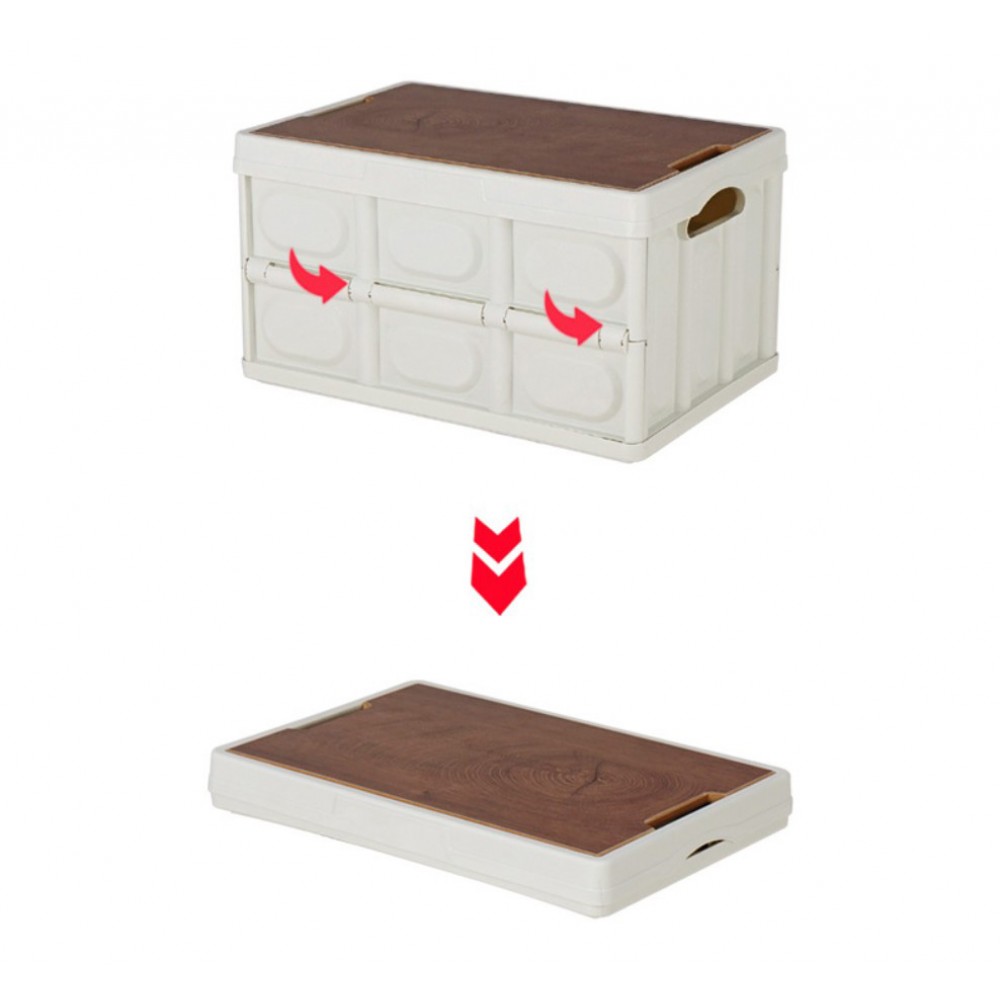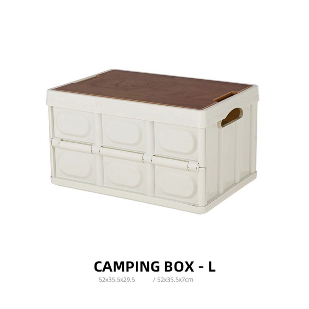 Складний кемпінговий ящик-столик — місткий органайзер для зберігання речей під час пікніка, кемпінгу, риболовлі, поїздки на дачу або автоподорожі. Усередину зручно складати посуд, продукти, туристичні аксесуари, плед або інші дрібниці, а дерев'яну кришку можна використовувати як невелику стільницю. Ящик складається до плоского формату, має бокові ручки для перенесення і добре підходить для багажника автомобіля або зберігання вдома.