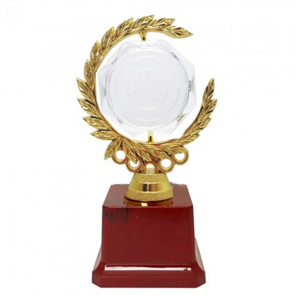 Подарункова статуетка виконана у вигляді вінка з лаврового листя з пластику з покриттям під золото, всередині якого розташований прозорий кристал на стійкій підставці. Кристал крутиться навколо своєї осі на 365 градусів. Такий сувенір стане чудовою прикрасою інтер'єру і подарунком, що запам'ятовується.