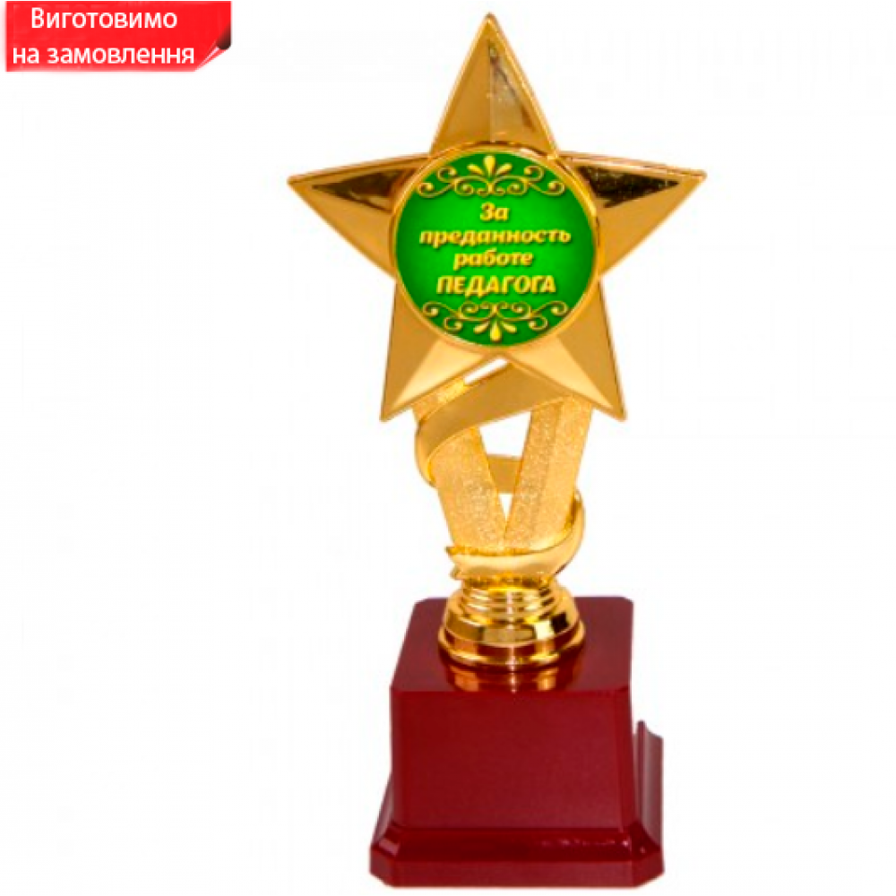 Статуетка 570905 За відданість роботі педагога Золота зірка - чудова та оригінальна нагорода, її можна вручити та нагородити вчителі, подарувати класному керівнику. Подарунок символічний і незвичайний, який говорить як дорогий для Вас вітається! Статуетка виконана у вигляді 3D композиції зірок та медалі, усередині якої напис українською мовою. Фігурка виконана золотим кольором на класичному бордовому п'єдесталі. Статуетка упаковується в індивідуальний тубус з прозорого пластику. Унікальне пакування розроблене компанією Карнавал Жартів. На бордовому п'єдесталі статуетки може бути присутня імітація мармурових розлучень. Оригінальні нагороди та призи в наявності та на замовлення – відмінна ціна. Великий вибір кубків, медалей та нагородних статуеток для будь-якого приводу в інтернет магазині Карнавал Жартів.