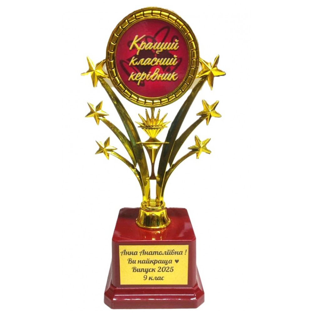 Статуетка Кращий класний керівник Зірковий салют - чудова та оригінальна нагорода, її можна вручити класному керівнику. Подарунок символічний і оригінальний, який говорить як шанована для Вас людина! Статуетка виконана у вигляді 3D композиції зірок та медалі, усередині якої напис українською мовою. Фігурка виконана золотим кольором на класичному бордовому п'єдесталі. Статуетка упаковується в індивідуальний тубус з прозорого пластику. Унікальне пакування розроблене компанією Подарок-ТУТ! На бордовому п'єдесталі статуетки може бути присутня імітація мармурових розводів. Оригінальні нагороди та призи в наявності та на замовлення – відмінна ціна. Великий вибір кубків, медалей та нагородних статуеток для будь-якого приводу в інтернет-магазині Подарок-ТУТ!