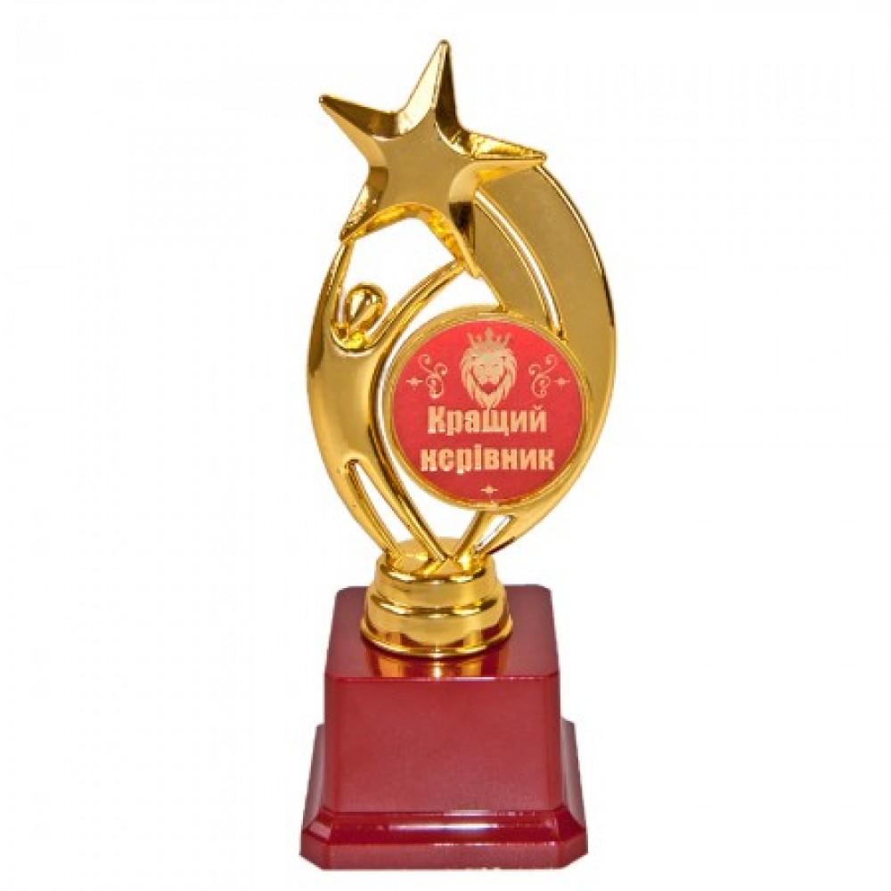 Статуетка "Кращий керівник" Зоряна година укр - відмінна та оригінальна нагорода, її можна вручити начальнику, директору, керівнику за заслуги в роботі, що показує наскільки цінна для Вас людина, яку вітаєте! Статуетка виконана у вигляді 3D композиції зірок. Фігурка виконана золотим кольором на класичному бордовому п'єдесталі. Статуетка упаковується в індивідуальний тубус з прозорого пластику. Унікальне пакування розроблене компанією Подарок-ТУТ. На бордовому п'єдесталі статуетки може бути присутня імітація мармурових розводів. Оригінальні нагороди та призи в наявності та на замовлення за чудовою ціною. Великий вибір кубків, медалей та нагородних статуеток для будь-якого приводу в інтернет магазині Подарок-ТУТ!