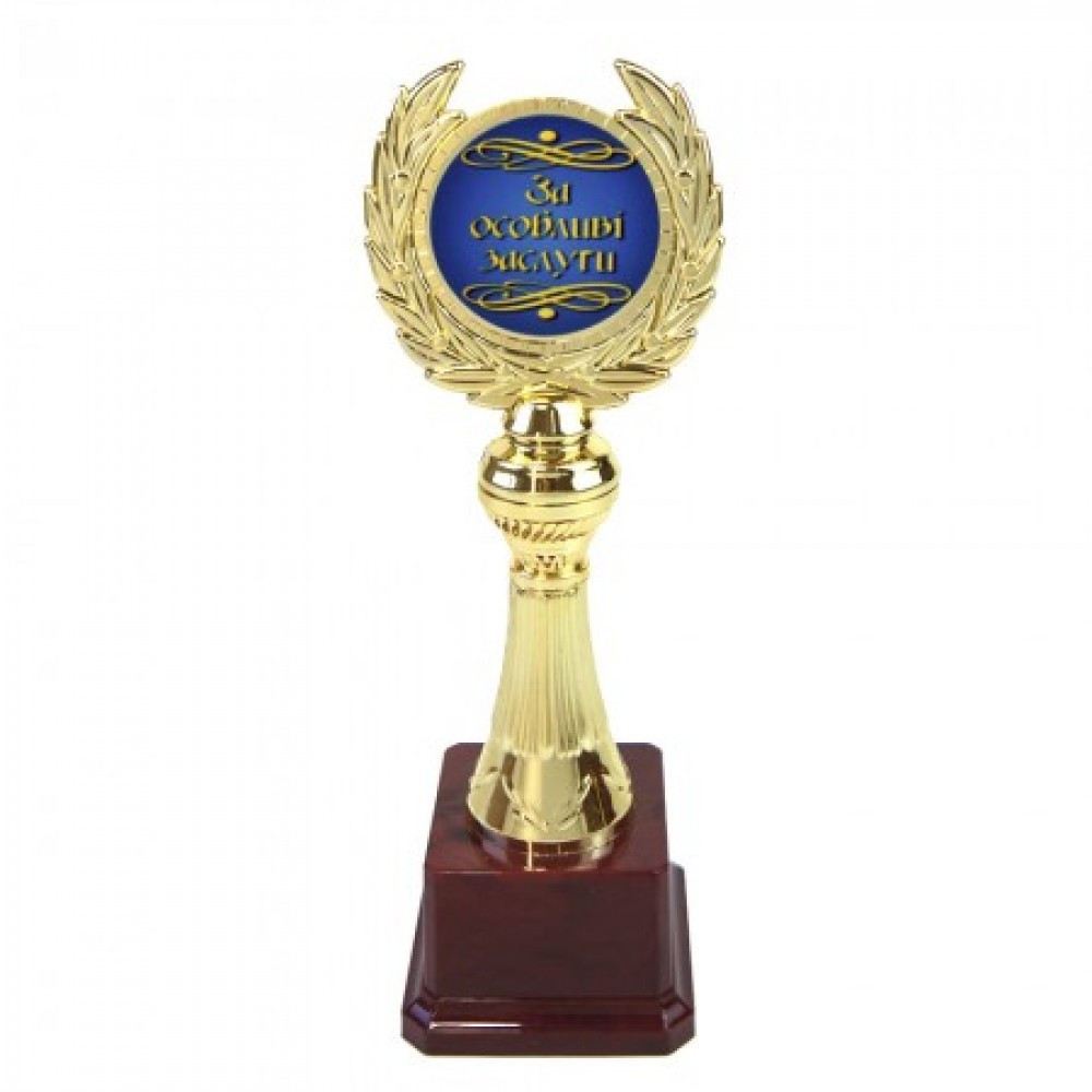 Статуетка За особливі заслуги Лавровий вінок українською мовою - чудова та оригінальна нагорода співробітникам чи колегам за особливі заслуги. Подарунок символічний і незвичайний, який говорить як дорога для Вас людина яку вітаєте! Статуетка виготовлена у вигляді 3D композиції. Фігурка виконана золотим кольором на класичному бордовому п'єдесталі. Статуетка упаковується в індивідуальний тубус з прозорого пластику. Унікальне пакування розроблене компанією Подарок-тут! На бордовому п'єдесталі статуетки може бути присутня імітація мармурових розводів. Оригінальні нагороди та призи в наявності та на замовлення – відмінна ціна. Великий вибір кубків, медалей та нагородних статуеток для будь-якого приводу в інтернет магазині Подарок-тут!