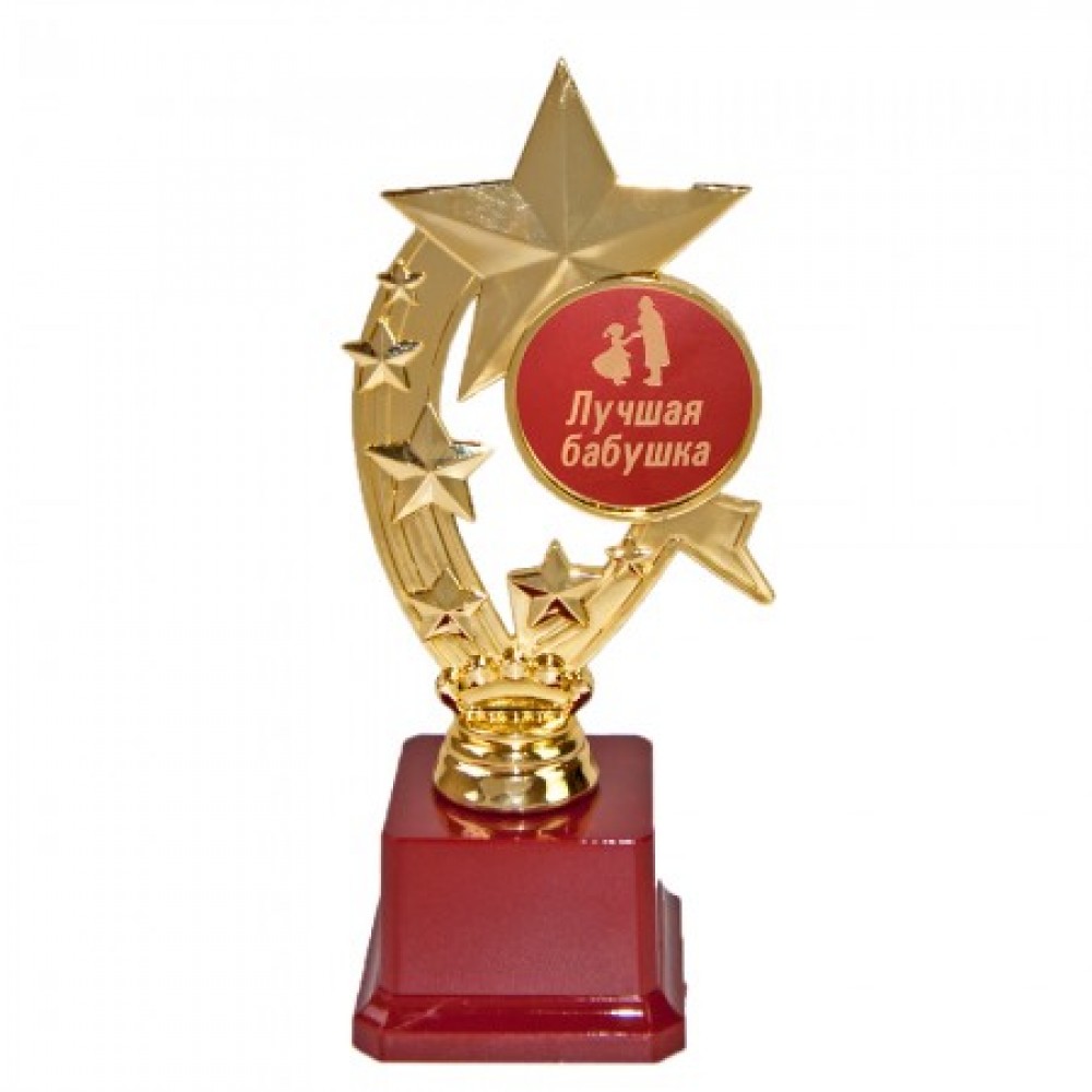 Статуетка (Найкраща бабуся) Зірковий час – чудовий та оригінальний сюрприз, яку можна подарувати бабусі на ювілей, на день народження або просто як презент разом з якимсь подарунком. Подарунок символічний і незвичайний, який говорить яка дорога для Вас бабуся! Статуетка виконана у вигляді 3D композиції зірок, золотим кольором на класичному бордовому п'єдесталі. Статуетка упаковується в індивідуальний тубус з прозорого пластику. Унікальне пакування розроблене компанією Подарок-тут! На бордовому п'єдесталі статуетки може бути присутня імітація мармурових розводів. Оригінальні нагороди та призи в наявності та на замовлення – відмінна ціна. Великий вибір кубків, медалей та нагородних статуеток для будь-якого приводу в інтернет магазині Подарок-тут!