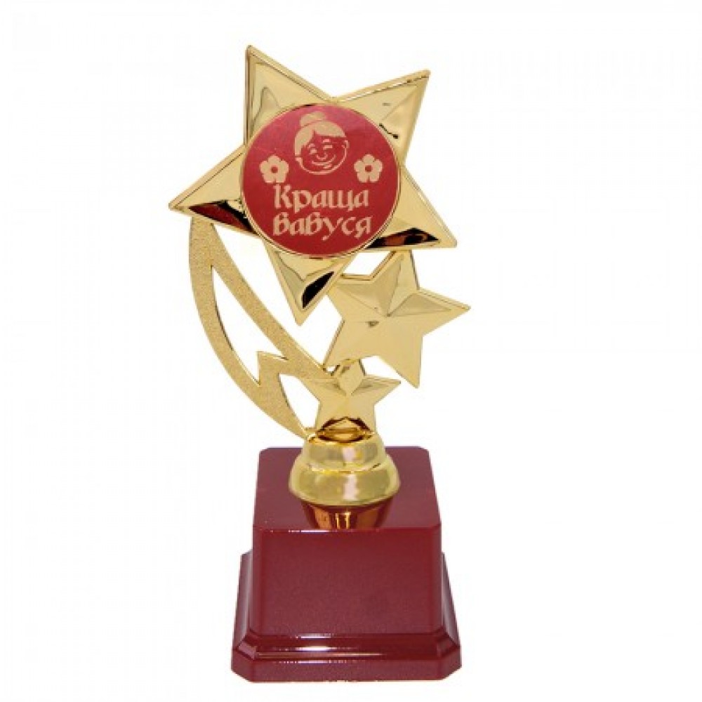 Статуетка (Найкраща бабуся) Зірковий політ – відмінний та оригінальний сюрприз, її можна подарувати Бабусі на ювілей, а можна на день народження або просто як презент разом з якимсь подарунком. Подарунок символічний і незвичайний, який говорить яка рога для Вас бабуся! Статуетку виконано у вигляді 3D композиції зіркового польоту, всередині якої напис українською мовою. Фігурка виконана золотим кольором на класичному бордовому п'єдесталі. Статуетка упаковується в індивідуальний тубус з прозорого пластику. Унікальне пакування розроблене компанією Подарок-тут. На бордовому п'єдесталі статуетки може бути присутня імітація мармурових розводів. Оригінальні нагороди та призи в наявності та на замовлення – відмінна ціна. Великий вибір кубків, медалей та нагородних статуеток для будь-якого приводу в інтернет магазині Подарок-ТУТ!