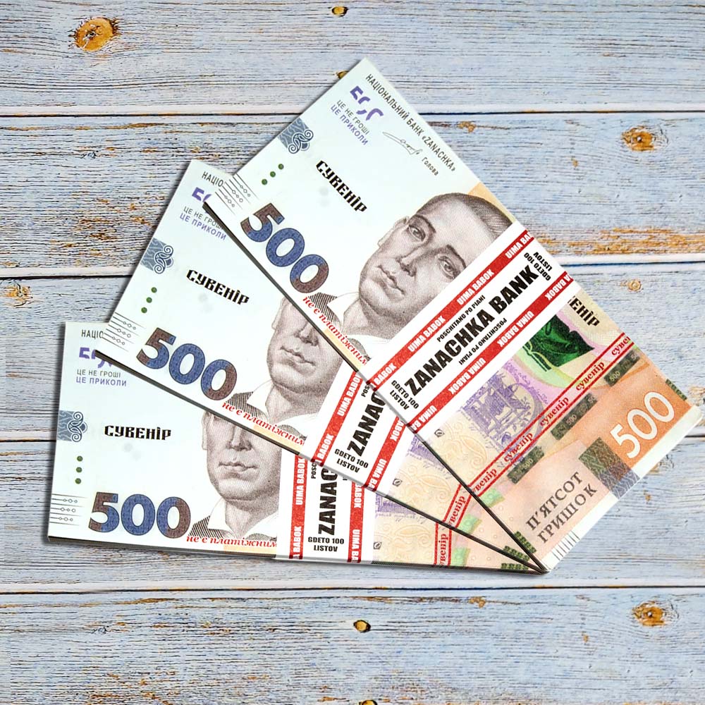 Сувенірні подарункові гроші Пачка грошей по 500 гривень виконана з паперу з двостороннім якісним друком. На Купюрі є напис Сувенір. У пачці 80 купюр. Сувенірна пачка гривень від заначка банку ідеально підходитиме для проведення весільного обряду викупу нареченої, провидіння різноманітних конкурсів на заходах, для наповнення подарунків – приколів. Ви можете купити гроші оптом від виробника. Інтернет магазин Подарок-тут! пропонує купити оптом цікаві та оригінальні подарунки за низькими цінами, а також Ви можете оформити замовлення на сайті і задати будь-які запитання менеджеру, замовивши дзвінок на нашому сайті.
