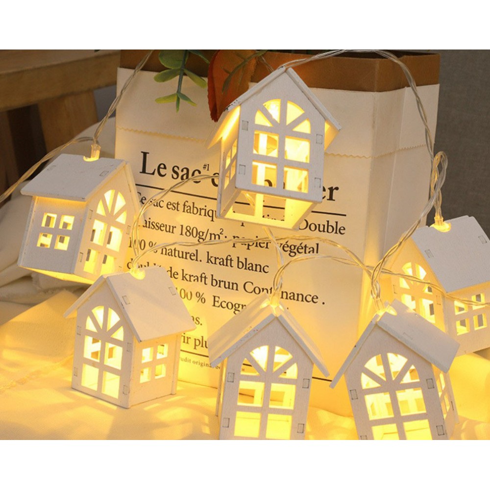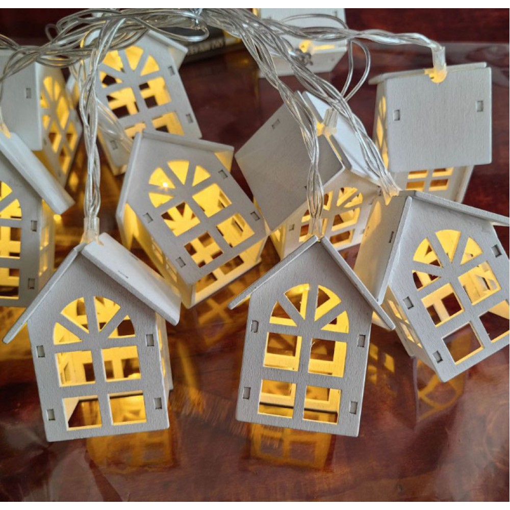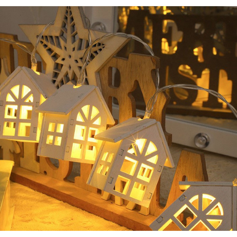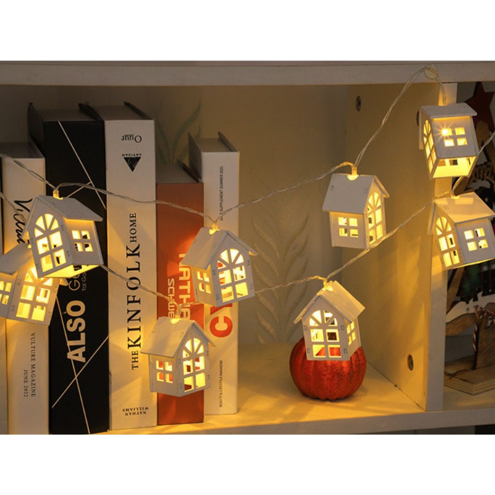 Ця гірлянда виглядає як маленьке затишне містечко: білі дерев'яні будиночки з "віконцями", всередині яких м'яко світиться тепле світло. Вмикаєш — і відразу з'являється відчуття затишку, ніби вдома вже пахне мандаринами та святом. Будиночки об'ємні, помітні, тому гірлянда гарно виглядає не тільки на ялинці, але й на полиці, біля дзеркала, на стіні, на вікні, в дитячій або у фотозоні.