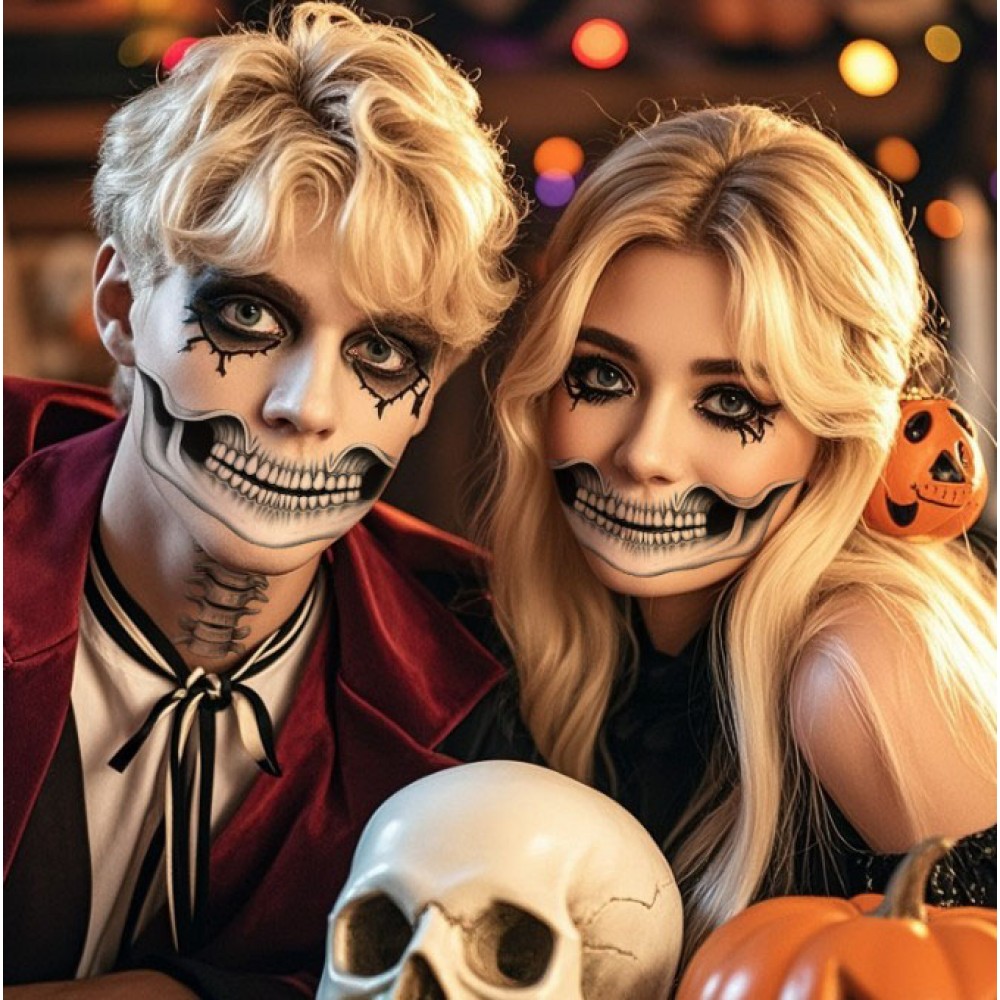 Готове рішення для вау-гриму на Хелловін, косплей і вечірки. За 60 секунд отримуєте кінематографічний «скелетний» оскал і шийні хребці без фарб і візажиста.