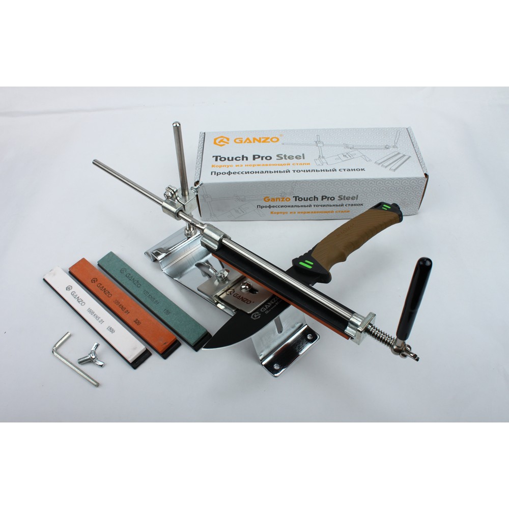 На відміну від інших точілок Ganzo, модель Ganzo Touch Pro Steel — повністю металева, що підвищує її міцність і довговічність. Крім того, під час заточування, клинок можна зафіксувати в потрібному положенні за допомогою сталевої направляючої пластини. Ця особливість гарантує повну безпеку для користувача під час заточування ножа, але й накладає певні обмеження. Металеві деталі можуть залишити дрібні подряпини на поверхні ножа. Тому перед заточуванням рекомендується наклеїти на клинок з обох сторін малярську стрічку, ізоляційну стрічку або будь-яке інше захисне покриття, яке зможе захистити лезо від прямого контакту з металом направляючої пластини і підстави.