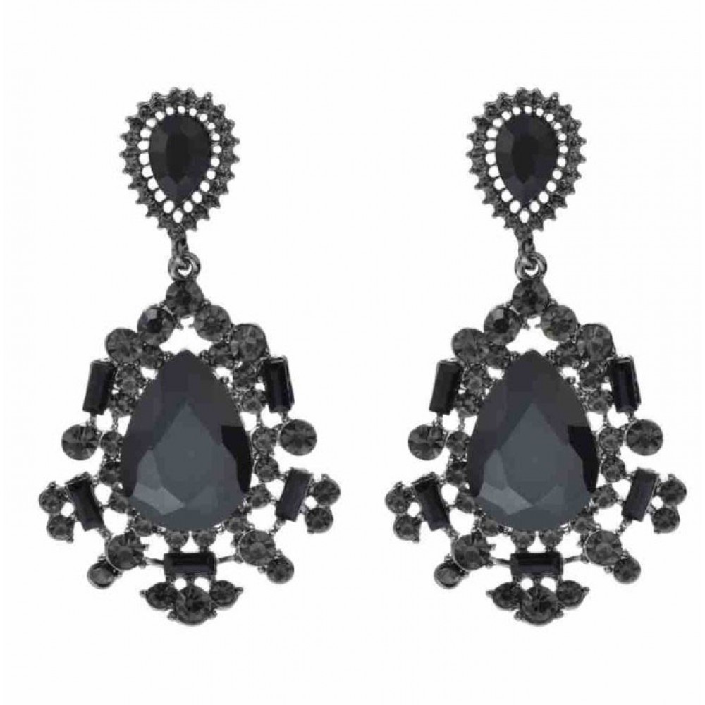 Ці сережки виглядають так, ніби їх принесли прямо зі зйомок фільму про розкішні та небезпечні 20-ті. Темний метал, велика крапля-камінь у центрі та щільна розсип дрібних страз створюють по-справжньому драматичний акцент. У вухах вони виглядають як вечірня біжутерія, а не простий карнавал: блиск глибокий, графітовий, без зайвої мішури.