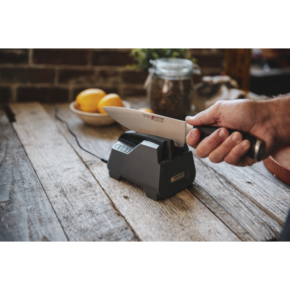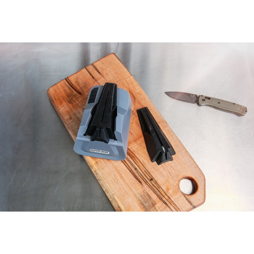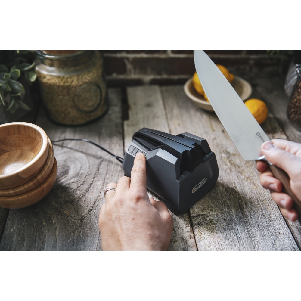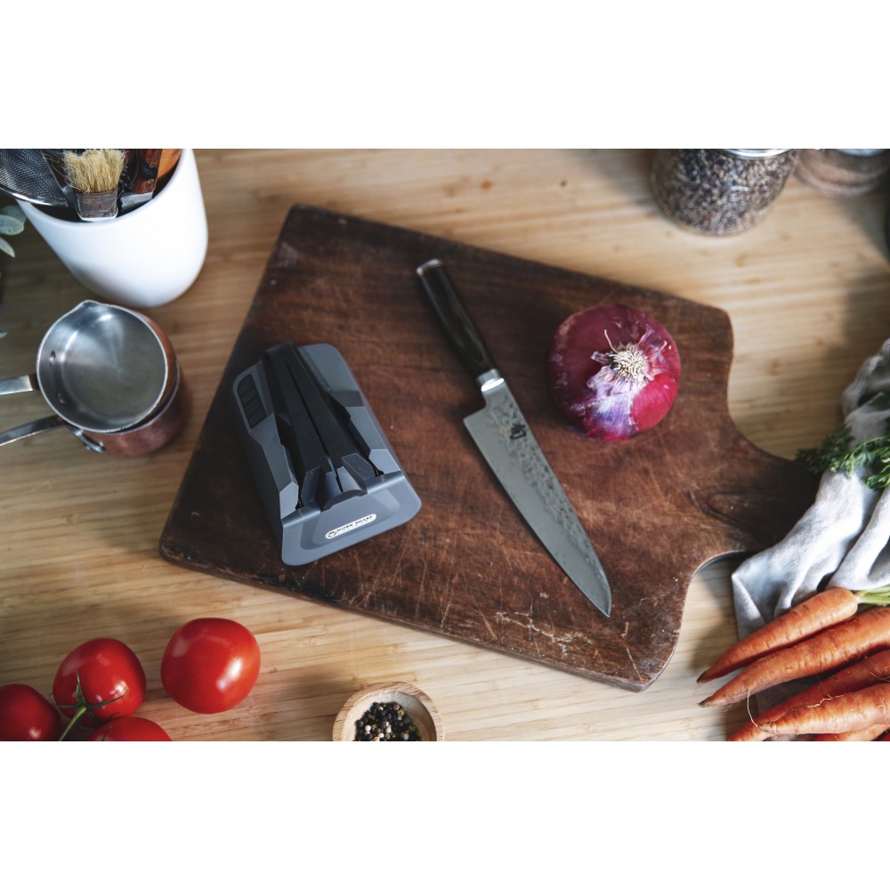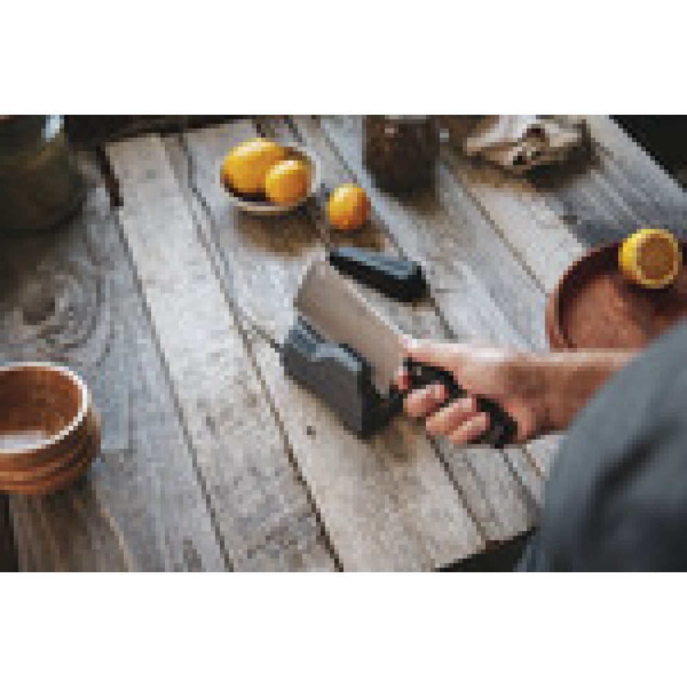 Точилка для кухонних і кишенькових ножів Work Sharp Culinary E2 Plus це новий, інноваційний спосіб заточування всіх ваших кухонних ножів. На відміну від більшості точілок, в яких використовуються алмазні шліфувальні пластини, у виробах Work Sharp Culinary застосовуються гнучкі абразивні диски для більш м'якої заточування і більш гострого краю. Вбудовані кутові напрямні (20°) забезпечують ідеальний, рівномірний край для бездоганного зрізу від кінчика до п'яти, а автоматичний таймер дозволяє дізнатися, коли лезо вже досить опрацьовано.Компактний дизайн Work Sharp Culinary E2 Plus означає, що вам знадобиться менше місця для зберігання пристосування. У доповненні до кухонних ножів ця машина може заточити різні ножиці і кишенькові ножі. Вбудований керамічний шліфувальний слот дозволяє легко і швидко підправити заточку. E2 Plus створений для того, щоб стати невід'ємною частиною кухні, завдяки тому, що ваш найважливіший інструмент, тобто, ніж, завжди гострий і в робочому стані.