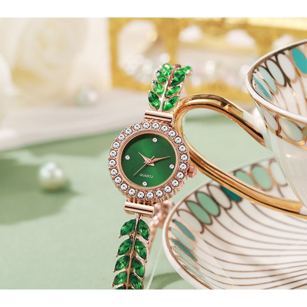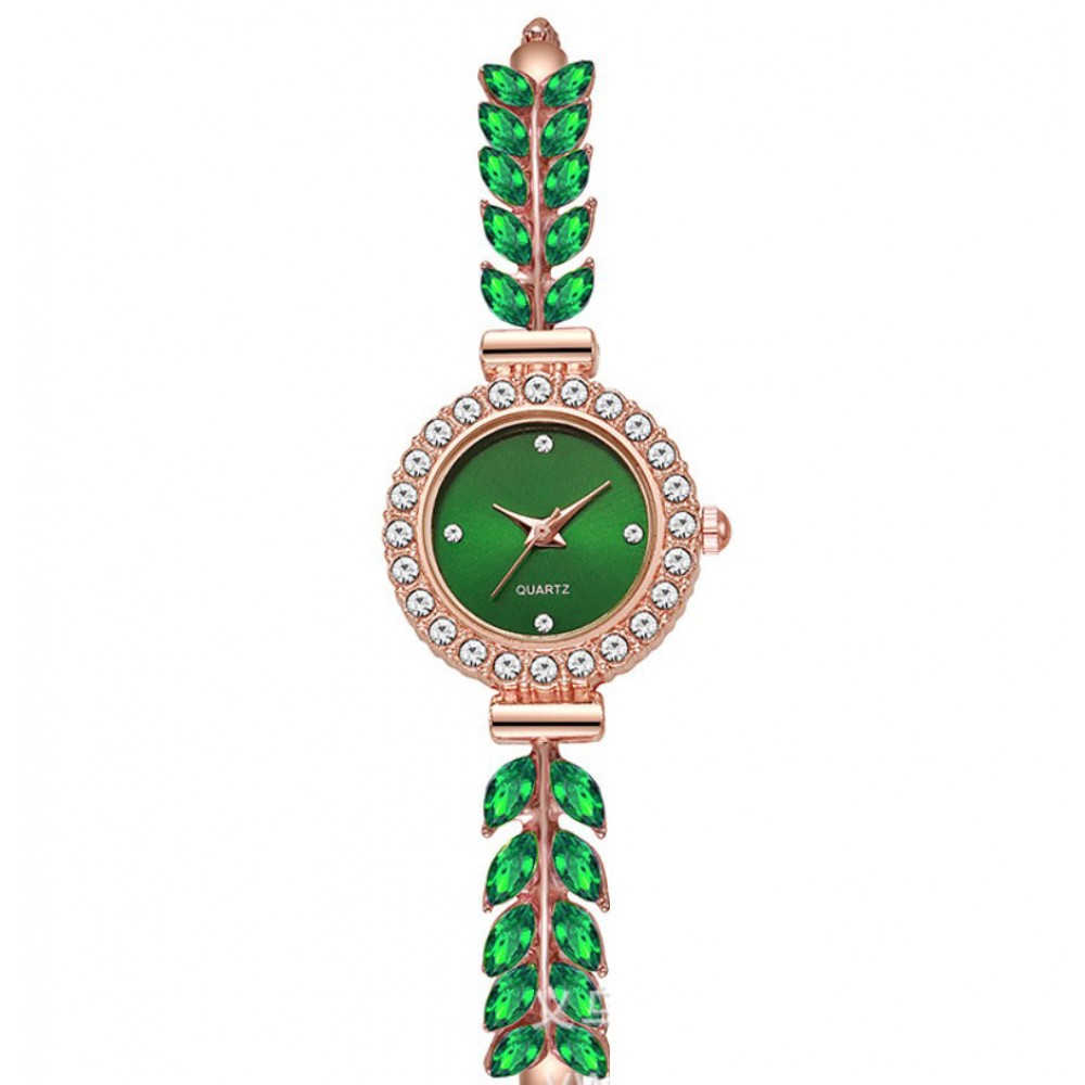 Жіночий годинник браслет з камінням Листя та стразами, смарагдово-зелений