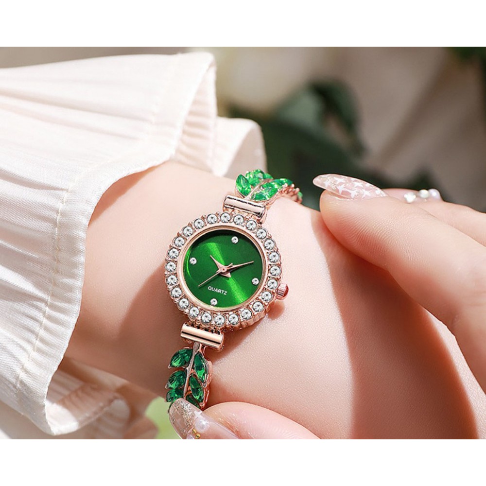 Жіночі годинники з декоративним браслетом у формі листя — це не просто аксесуар, а повноцінна прикраса, яка легко замінює браслет і робить образ більш дорогим та акуратним. Глибокий смарагдовий циферблат красиво переливається на світлі, а обрамлення з сяючих каменів надає годинникам ефект ювелірного виробу. Такі годинники чудово підходять для повсякденного носіння, фотосесій, свят та як подарунок дівчині чи жінці.