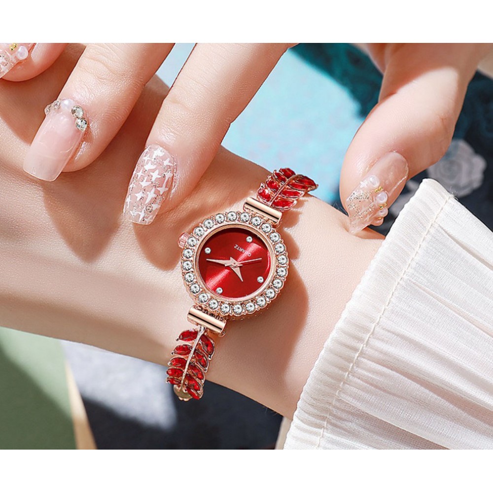 Жіночий годинник-браслет у насиченому червоному кольорі — це не просто спосіб дізнатися час, а яскравий акцент в образі. Круглий циферблат з камінням по контуру красиво переливається на світлі, а декоративні елементи у формі листя з червоними кристалами роблять модель схожою на ювелірну прикрасу. Такі годинники одразу привертають увагу і виглядають дорого навіть у повсякденному образі.