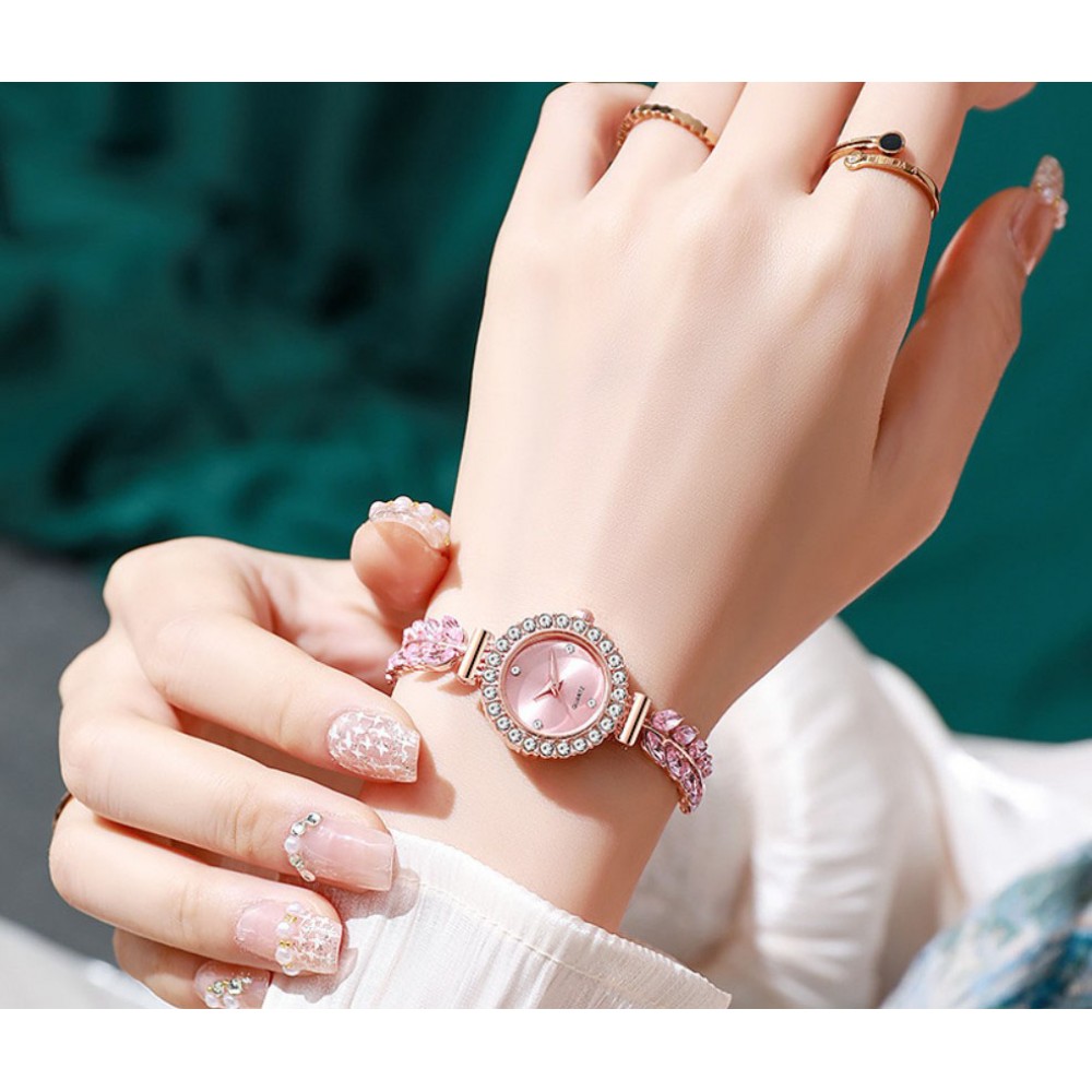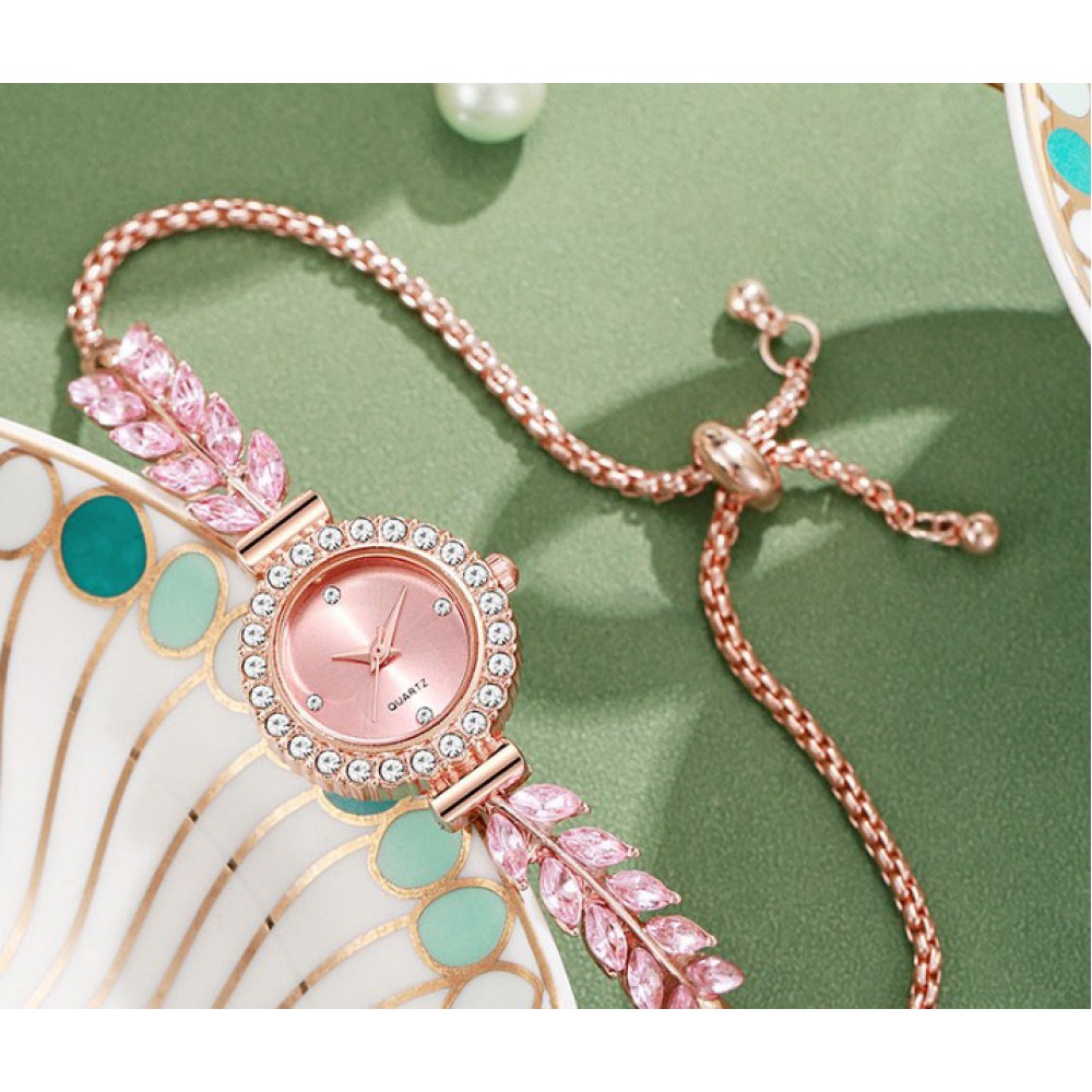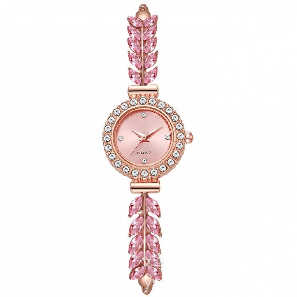 Жіночий годинник браслет Рожевий діамант лист — кварцовий наручний годинник з каменями та регульованим браслетом