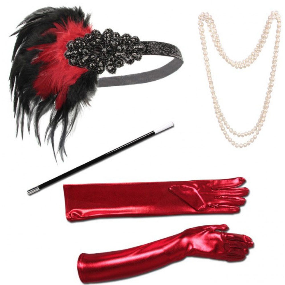 Цей комплект для тих, хто не боїться бути в центрі уваги. Яскравий, контрастний, зухвалий — саме такий образ ви отримаєте, надівши чорно-червону пов'язку з пір'ям, довгі червоні рукавички та перлинне намисто. А мундштук додасть потрібну нотку вінтажної розкоші.