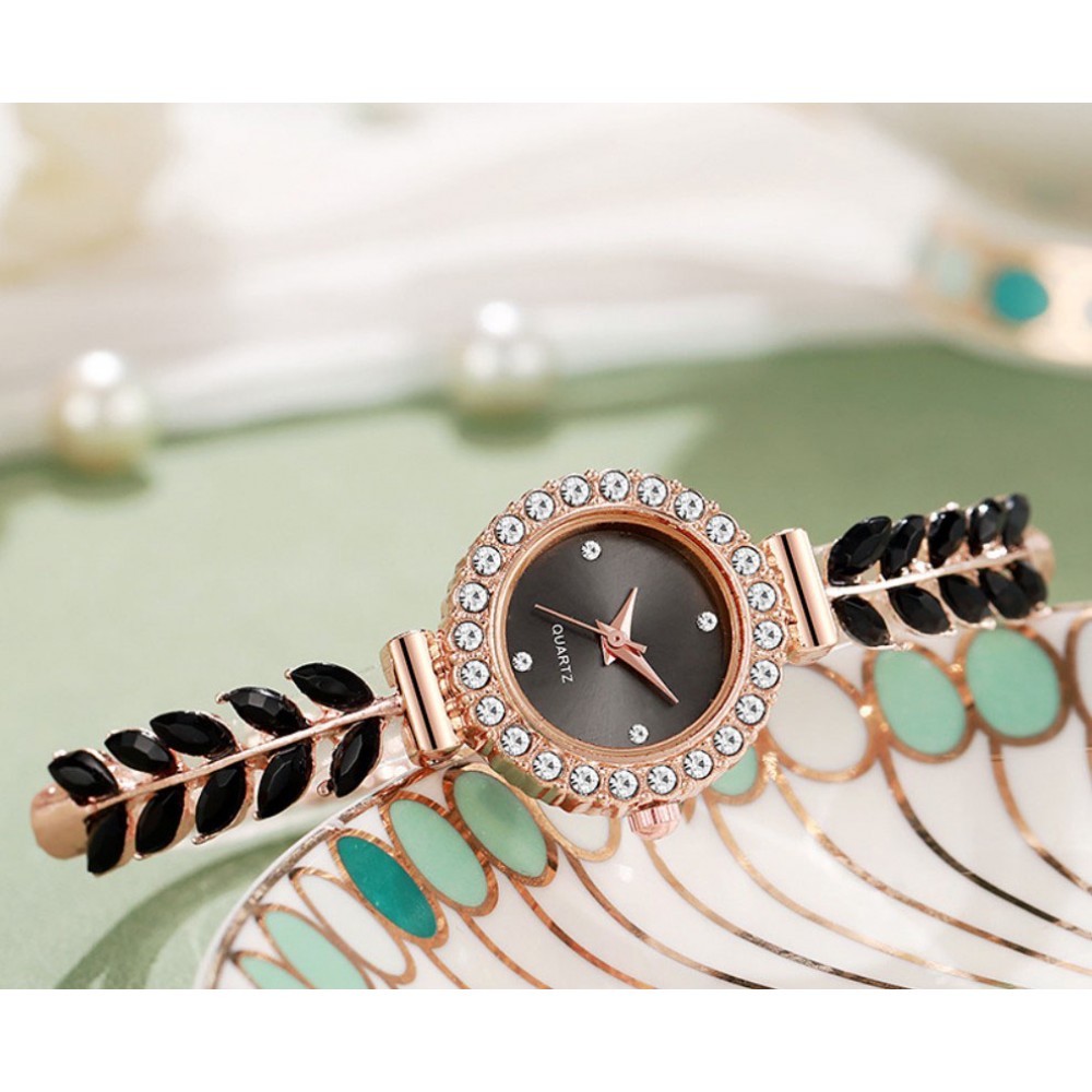 Жіночі годинники з камінням та витонченим браслетом — це аксесуар, який одразу привертає увагу і робить образ завершеним. Модель виконана в елегантному чорному кольорі з декоративними листочками та сяючими стразами навколо циферблата. Такий дизайн виглядає дорого, жіночно та універсально: годинники легко впишуться в повсякденний стиль, вечірній образ або стануть красивим акцентом на святі.